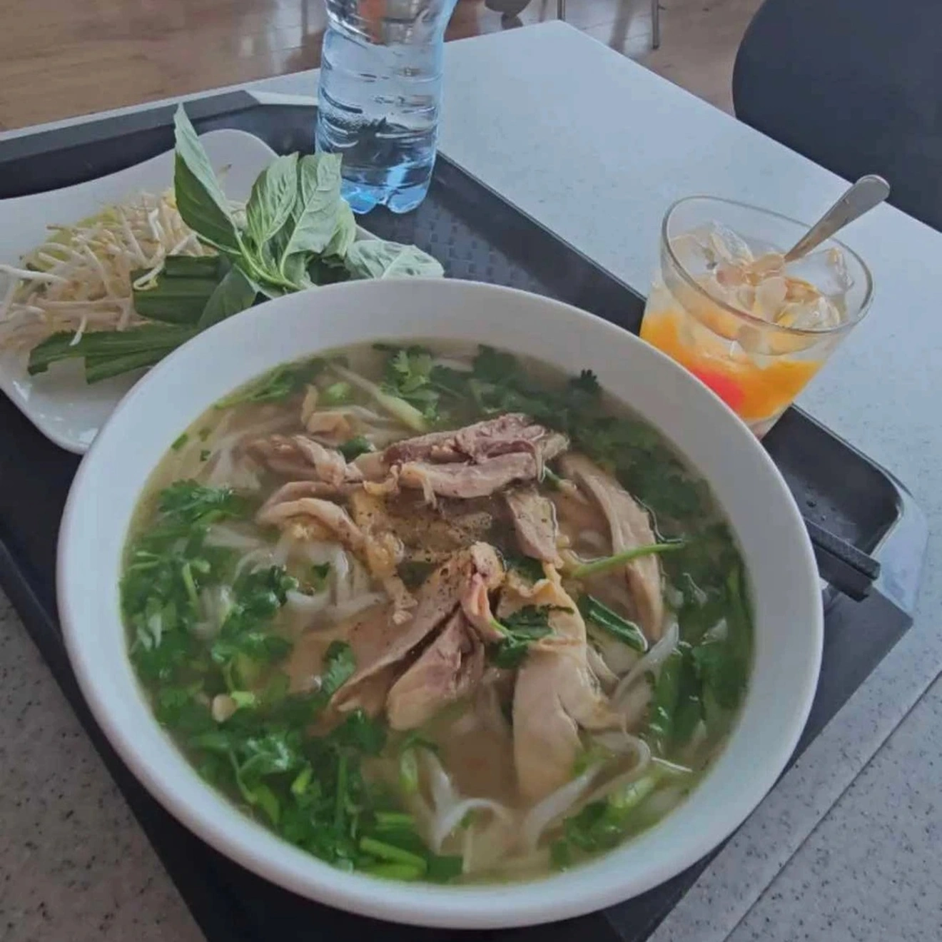 Bát phở gà kèm đồ uống giá gần 400.000 đồng ở sân bay Tân Sơn Nhất (Ảnh: Hanna).