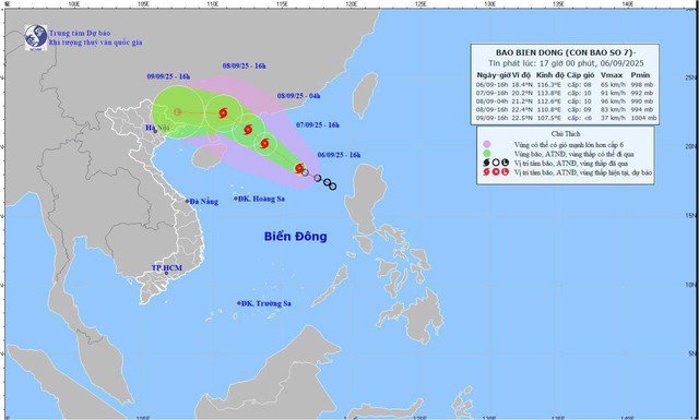 Dự báo lúc 16 giờ ngày 7/9, bão di chuyển theo hướng Tây Bắc với tốc độ 10-15km/h và tiếp tục mạnh thêm. Vị trí tâm bão ở khoảng 20,2 độ Vĩ Bắc; 113,8 độ Kinh Đông, cách đặc khu Hoàng Sa khoảng 420km về phía Đông Bắc. Sức gió mạnh cấp 9-10, giật cấp 12. Vùng nguy hiểm trên Biển Đông nằm trong khoảng vĩ tuyến 17,0-22,0 độ Bắc; kinh tuyến 112,0-117,5 độ Đông. Cấp độ rủi ro thiên tai cấp 3, ảnh hưởng đến vùng biển phía Bắc khu vực Bắc Biển Đông.