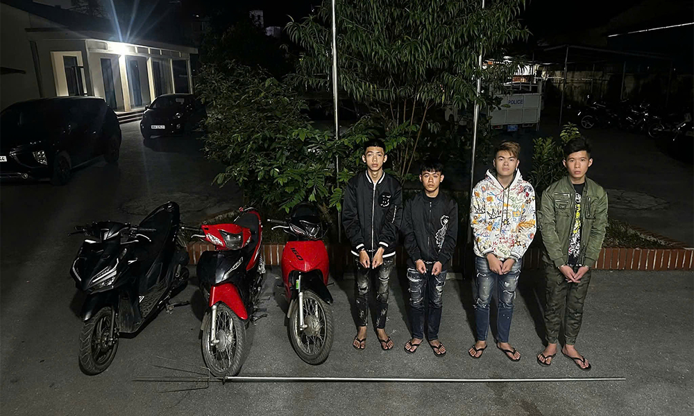 | Nhóm 4 thanh niên, thiếu niên cùng tang vật vụ án. |