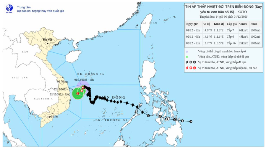 Theo Trung tâm Dự báo khí tượng thủy văn quốc gia, chiều nay (1-12), bão số 15 đã suy yếu thành áp thấp nhiệt đới trên biển Đông.