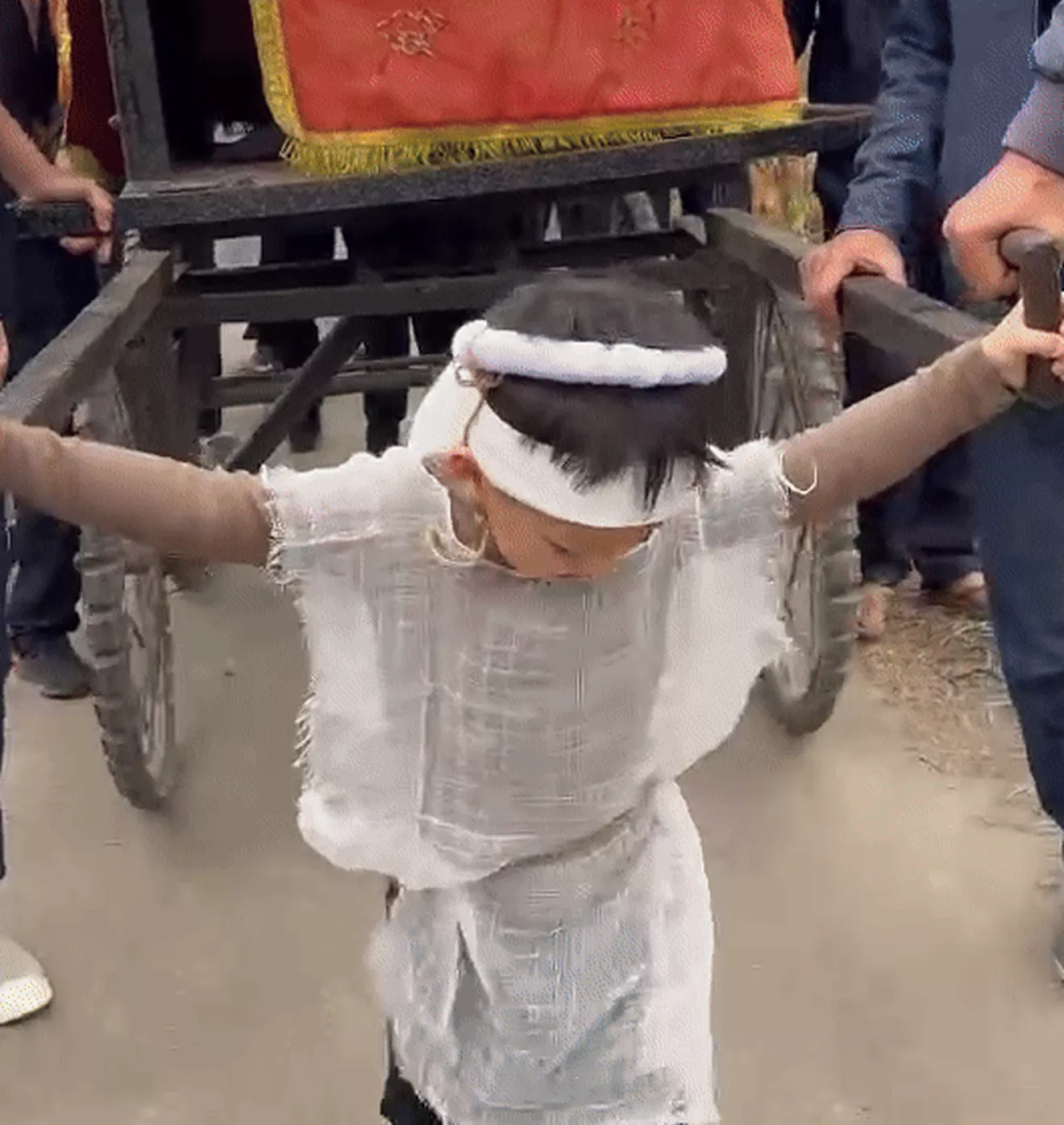 Cậu bé mặc chiếc áo tang trắng nhỏ xíu. Khi thấy bố được khiêng ra đồng, bé còn tưởng tượng đang đưa bố đi chơi nên dặn mọi người xung quanh cùng cố gắng.