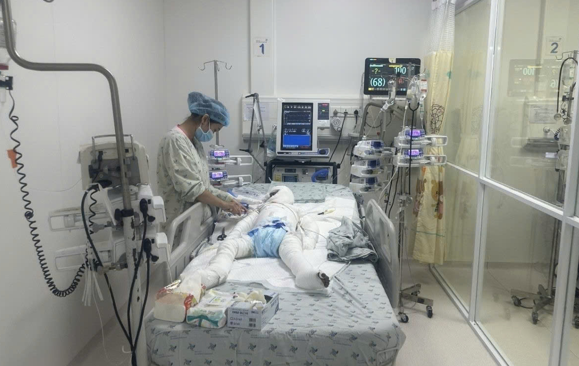 Sau đó bệnh nhi được chuyển nằm phòng cách ly, thở máy, hỗ trợ tuần hoàn, bù dịch, đặt VAC vết phỏng, ghép da đồng loại (người thân), dinh dưỡng tĩnh mạch, nuôi dưỡng qua ống thông dạ dày.
