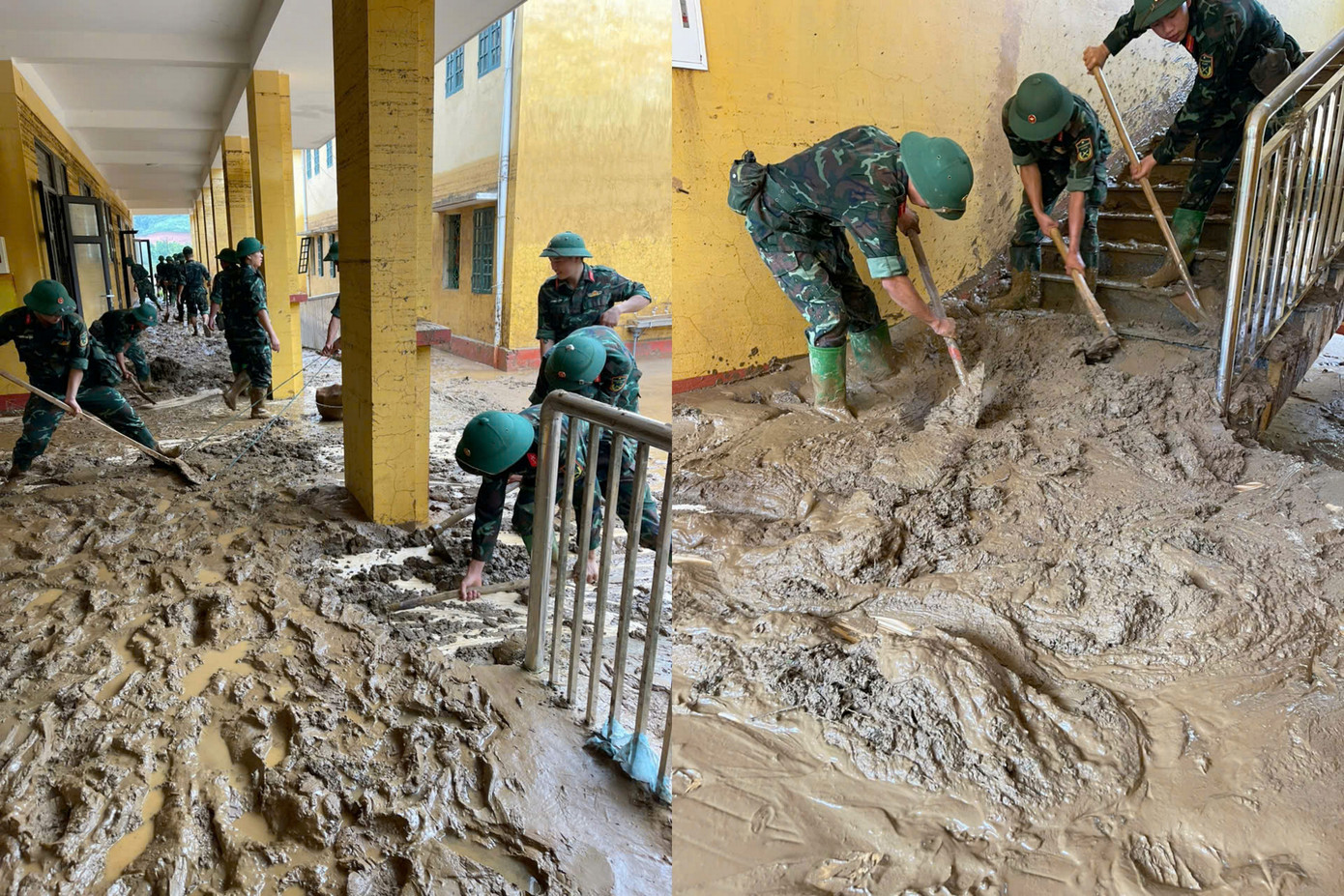Chiến sĩ Trung đoàn 254 (Bộ CHQS tỉnh Lào Cai) dọn dẹp bùn đất sau mưa lũ tại trường Phổ thông Dân tộc bán trú THCS Mỏ Vàng – một trong những cơ sở giáo dục bị thiệt hại nặng nề ở tỉnh Lào Cai.
