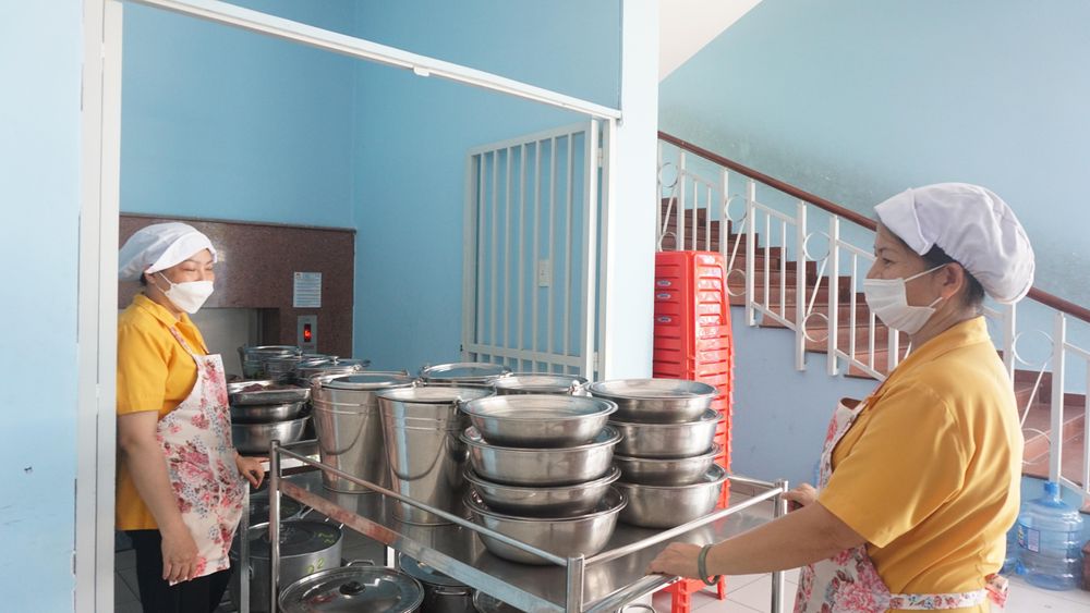 Mô hình khác tại Trường THCS Trường Thạnh (phường Long Phước) là ký hợp đồng với đơn vị chuyên môn để nấu ăn tại chỗ.
