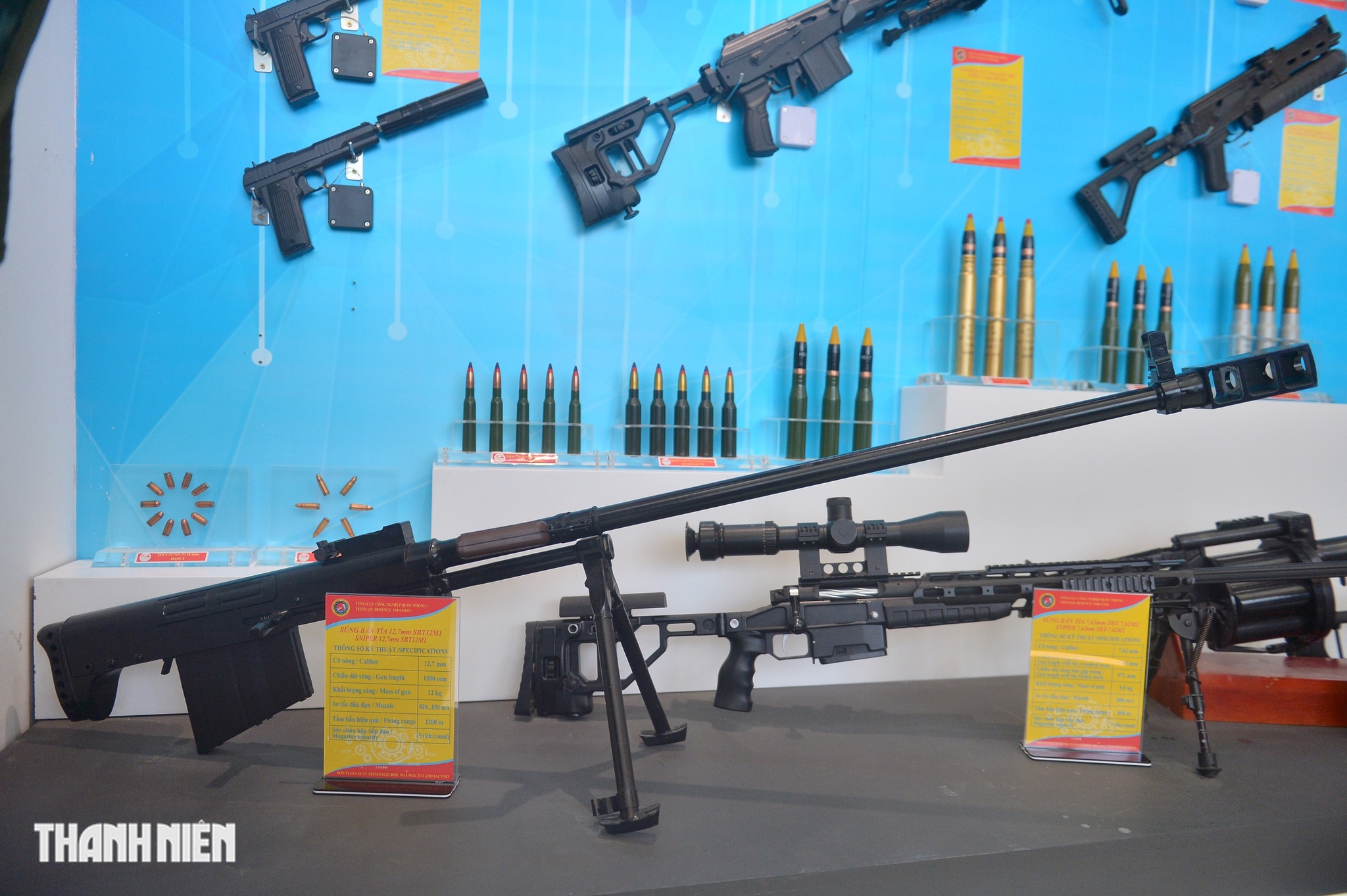 Súng bắn tỉa SBT12M1 (khẩu bên ngoài) có chiều dài 1,5 m, sử dụng đạn 12,7 mm, khối lượng súng 12 kg