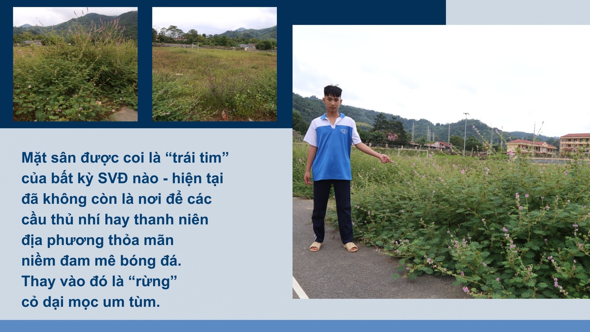 Em La Anh Tuấn, thôn Bản Mạc, xã Văn Bàn chia sẻ: “Trước kia, em hay ra đây đá bóng. Nhưng giờ mặt sân toàn cỏ dại, nhiều gai nên không đá bóng được nữa. Giờ chúng em phải đá bóng ở xung quanh nhà”.