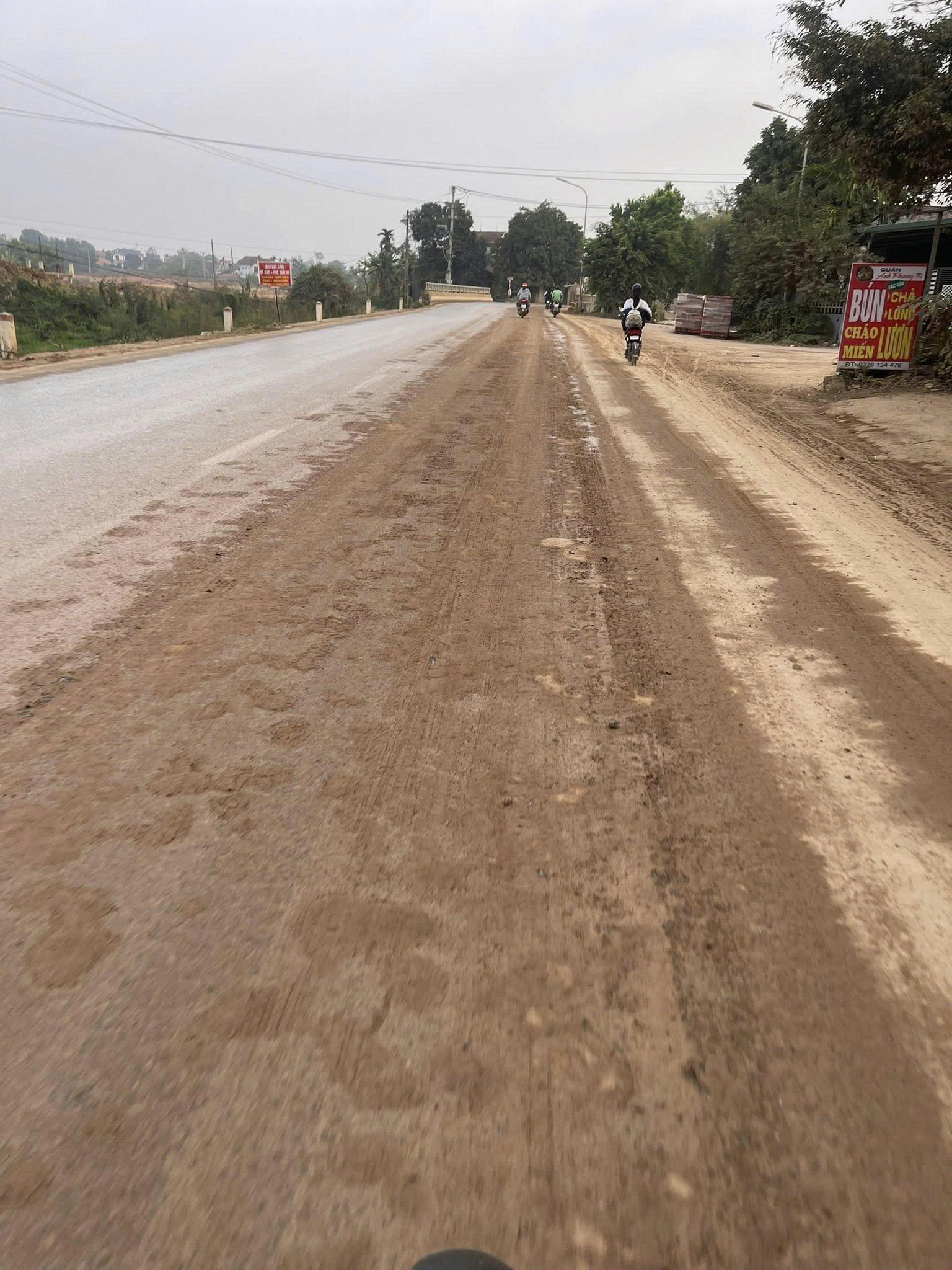 Biết rằng đang thi công làm đường thì khó tránh khỏi việc đất cát rơi vãi. Nhưng với khối lượng đất lớn như hiện tại, cộng thêm việc tưới nước hàng ngày, lớp đất này phủ lên mặt đường nhựa khiến đoạn đường trở nên cực kỳ trơn trượt và nguy hiểm.