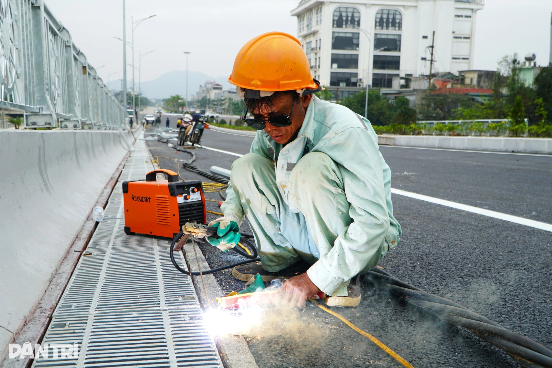 Bên trong công trường, đội ngũ công nhân đang khẩn trương lắp đặt lan can, rãnh thoát nước trên mặt cầu.