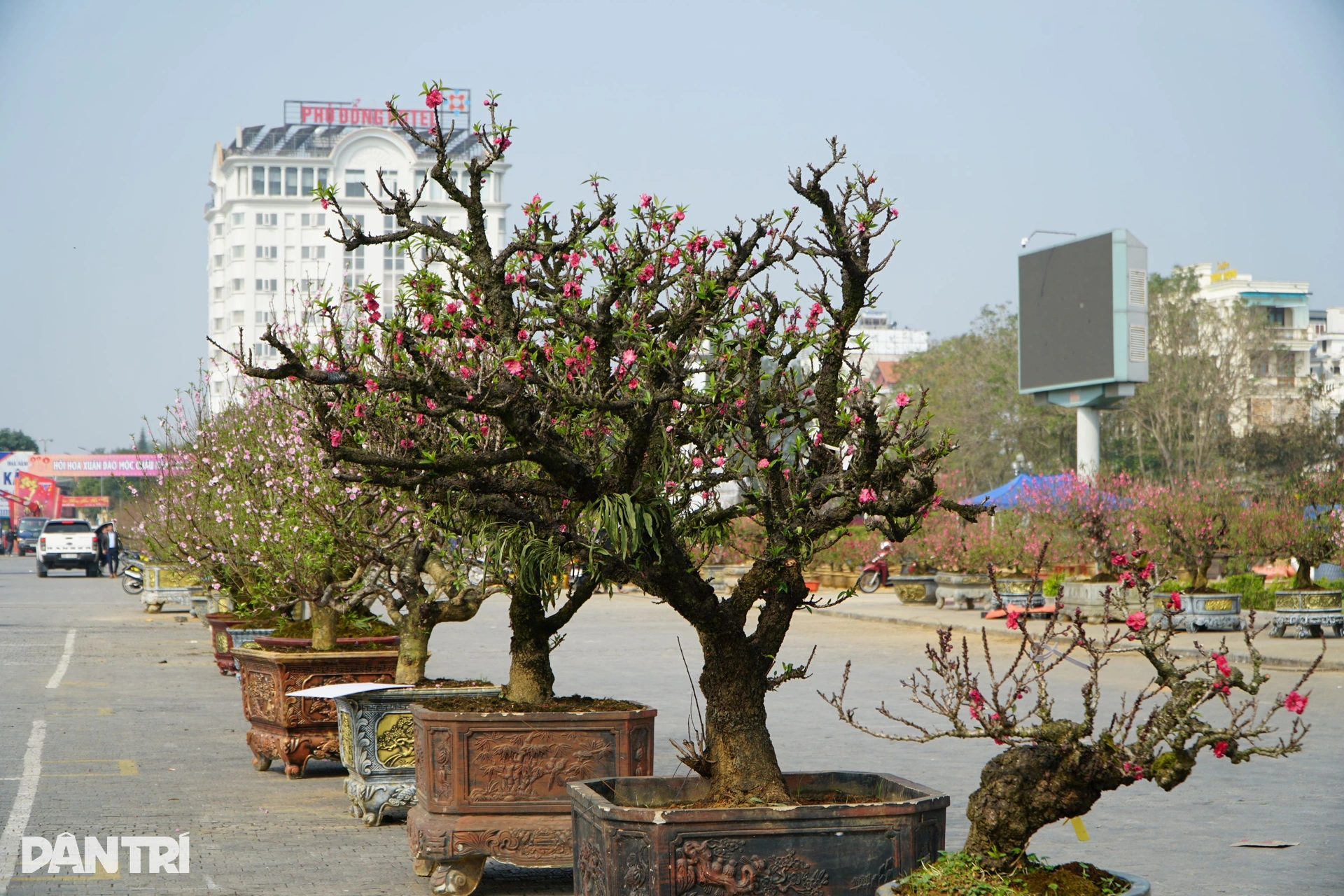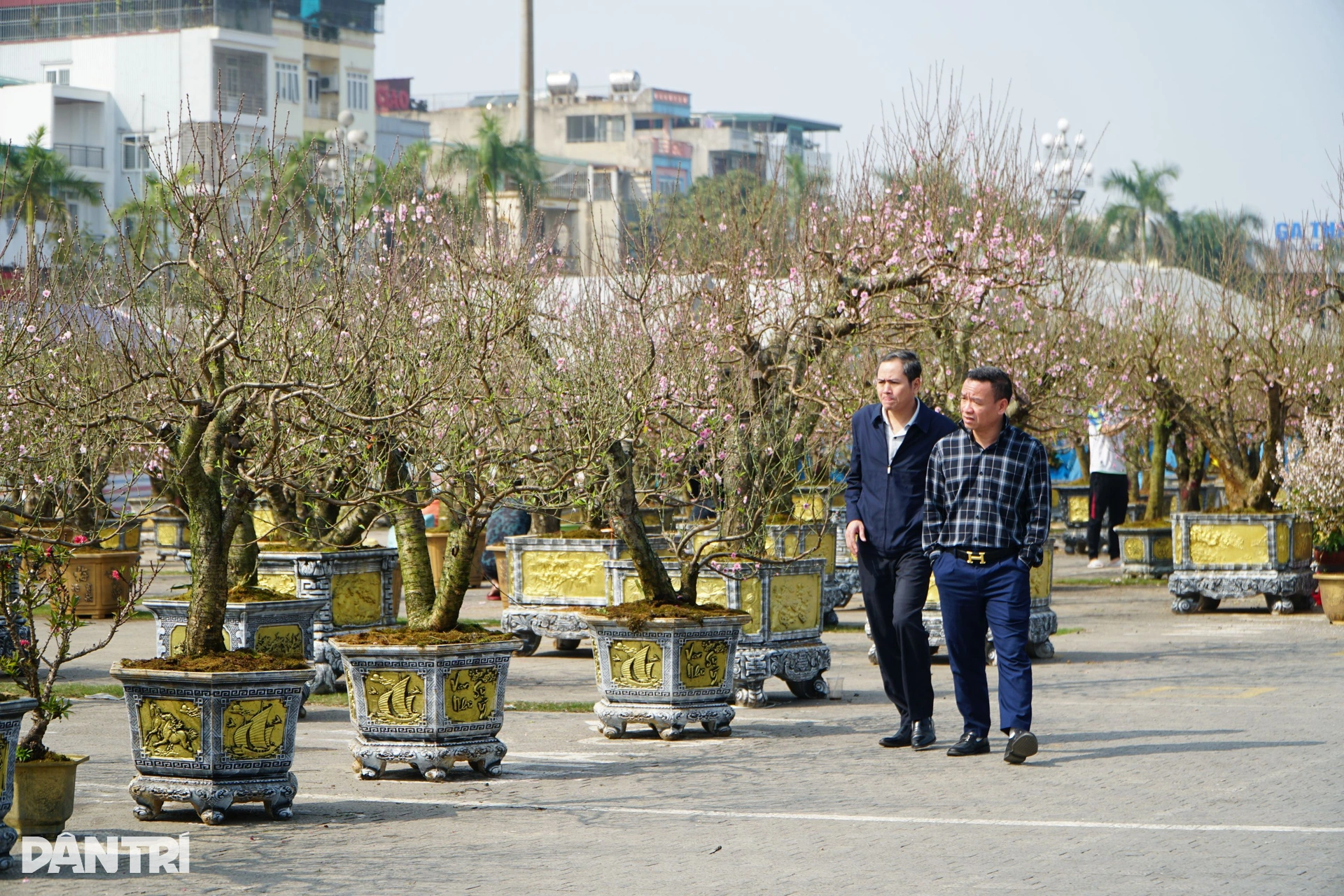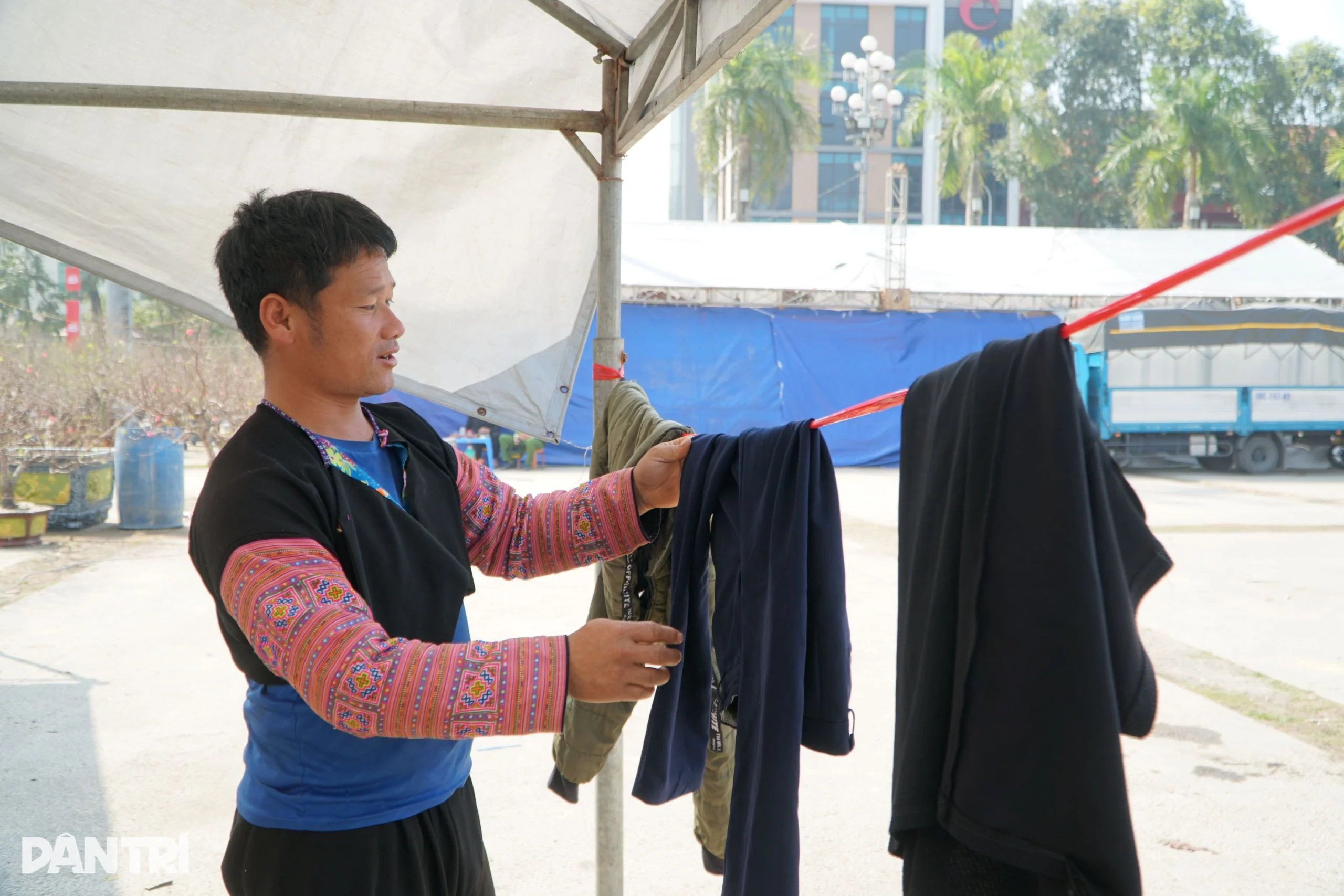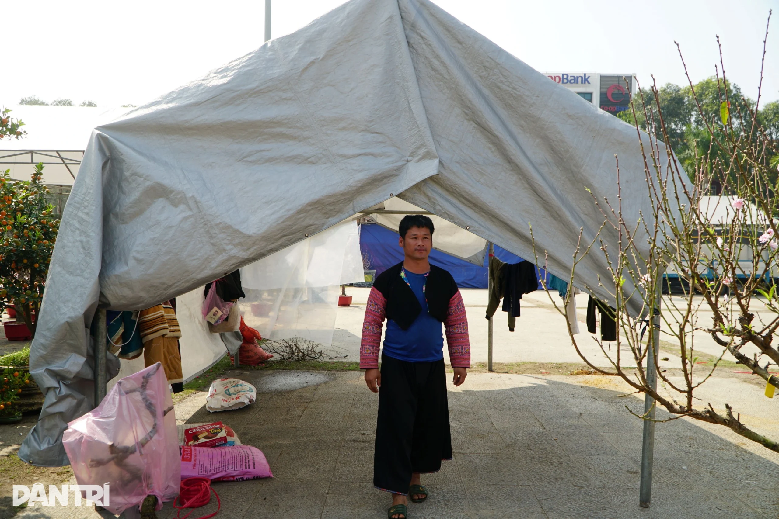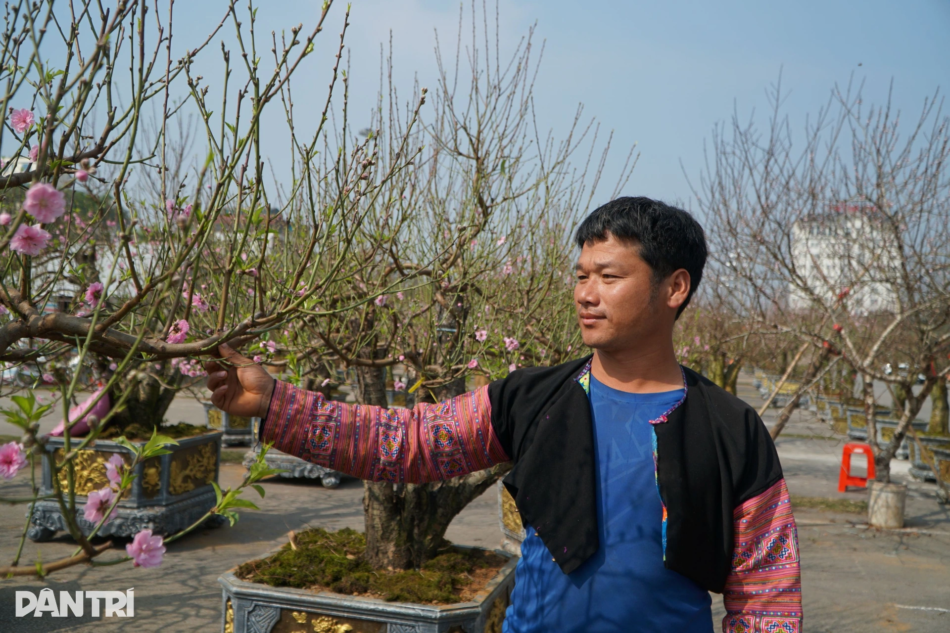 Trong số hàng trăm gian hàng hoa, cây cảnh, có một người bán đào thuê khá đặc biệt – anh Giàng A Dế (38 tuổi, bản Tà Phình, xã Tân Yên, tỉnh Sơn La). Anh Dế là người dân tộc Mông, quanh năm chủ yếu sống bằng nghề trồng mận và làm ruộng. Mỗi dịp cận Tết Nguyên đán, anh thường nhận đi bán đào thuê tại các tỉnh miền Bắc. Năm nay, anh được chủ thuê vào Thanh Hóa để bán hơn 50 gốc đào Mộc Châu.