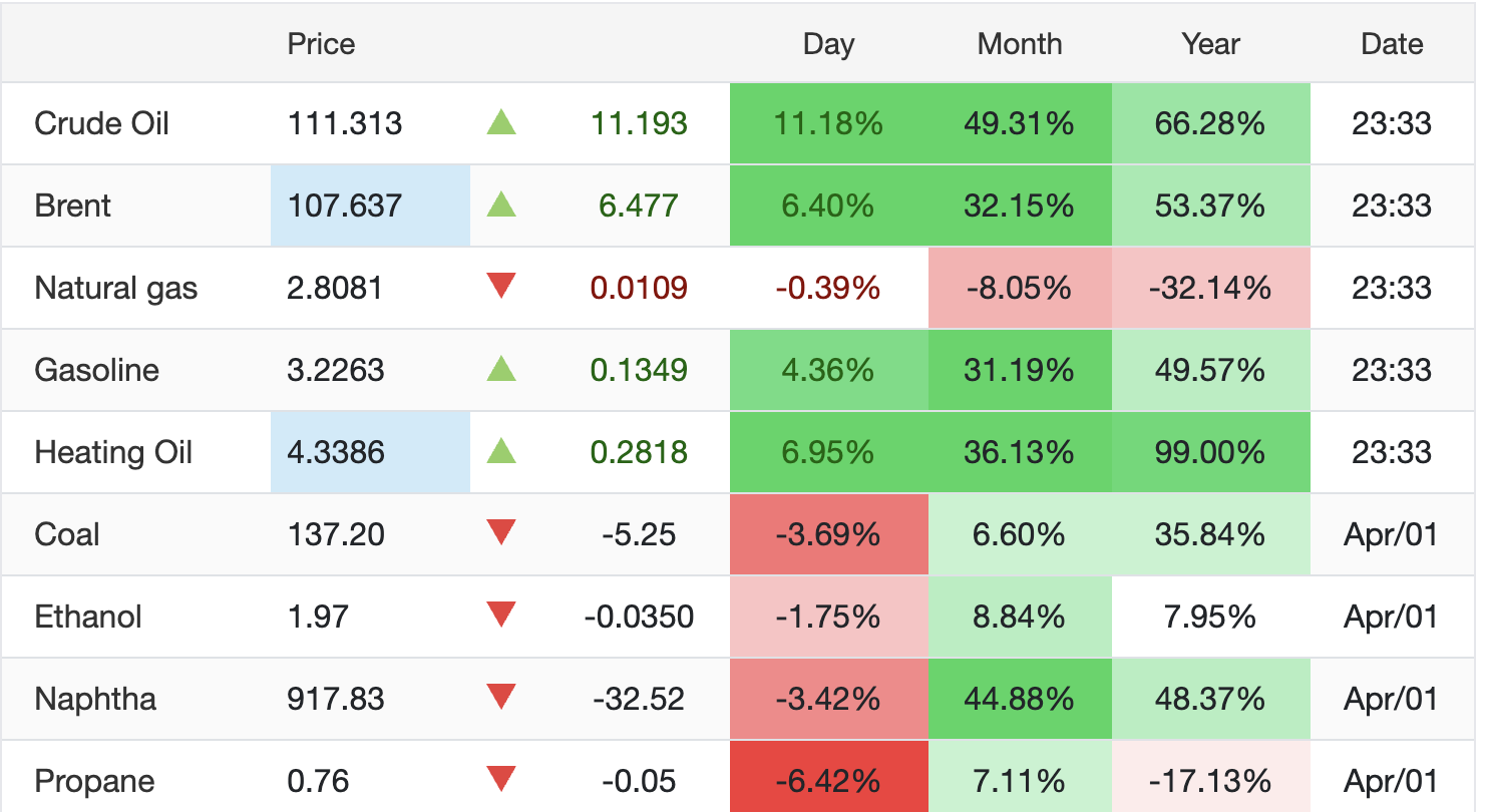 Cập nhật giá dầu thô thế giới mới nhất lúc 23 giờ 33 phút giờ Việt Nam, dầu WTI đã tăng lên mức 111,3 USD/thùng, tăng hơn 11 USD/thùng, mức tăng trên 11%; trong khi đó dầu Brent tại Mỹ giao dịch 107,6 USD, dù có tăng, song chỉ khoảng 6,4 USD/thùng, tương đương 6,4% theo ngày.