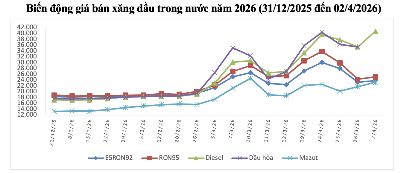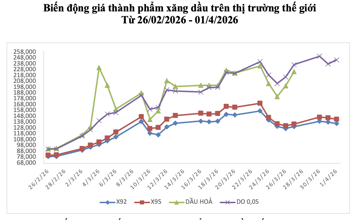 Giá thành phẩm xăng dầu thế giới bình quân giữa kỳ điều hành giá ngày 02/4/2026 và kỳ điều hành ngày 26/3/2026 là: 134,434 USD/thùng xăng RON92 dùng để pha chế xăng E5RON92 (tăng 3,384 USD/thùng, tương đương tăng 2,58%); 140,638 USD/thùng xăng RON95 (tăng 5,038 USD/thùng, tương đương tăng 3,72%); 237,282 USD/thùng dầu điêzen 0,05S (tăng 32,662 USD/thùng, tương đương tăng 15,96%); 697,832 USD/tấn dầu mazut 180CST 3,5S (tăng 60,002 USD/tấn, tương đương tăng 9,41%).