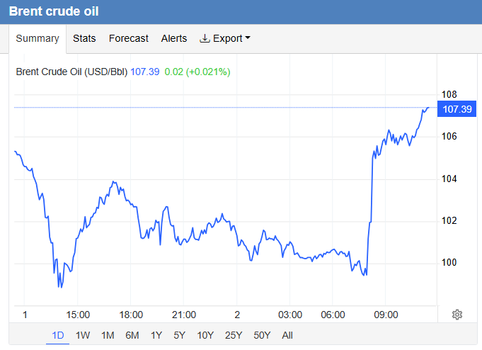Giá dầu thô lúc 11 giờ 20 ngày 2/4 (giờ Việt Nam) trên Trading Economics bật tăng dữ dội so với phiên mở cửa sáng nay. Ghi nhận giá dầu WTI tăng lên ngưỡng 105,2 USD, tăng hơn 5,1 USD/thùng, tương ứng hơn 5% theo ngày.