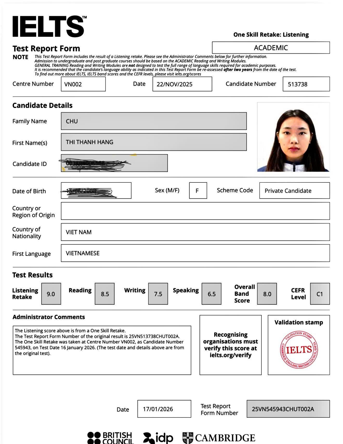 Em Chu Thị Thanh Hằng, học sinh lớp 12A4, Trường THPT Ngô Quyền, thôn Phú Nghĩa, xã Cổ Đô, đã đạt thành tích ấn tượng trong các kỳ thi đánh giá theo chuẩn quốc tế: