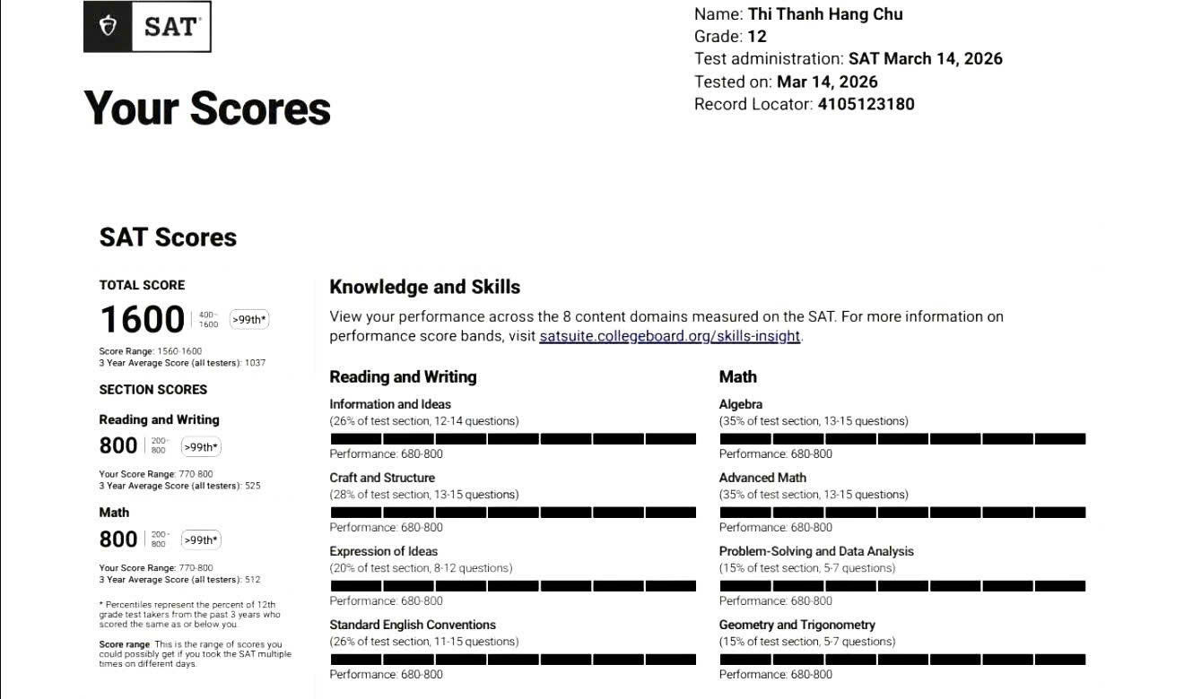 ✨ SAT: 1600/1600 (điểm tuyệt đối)
