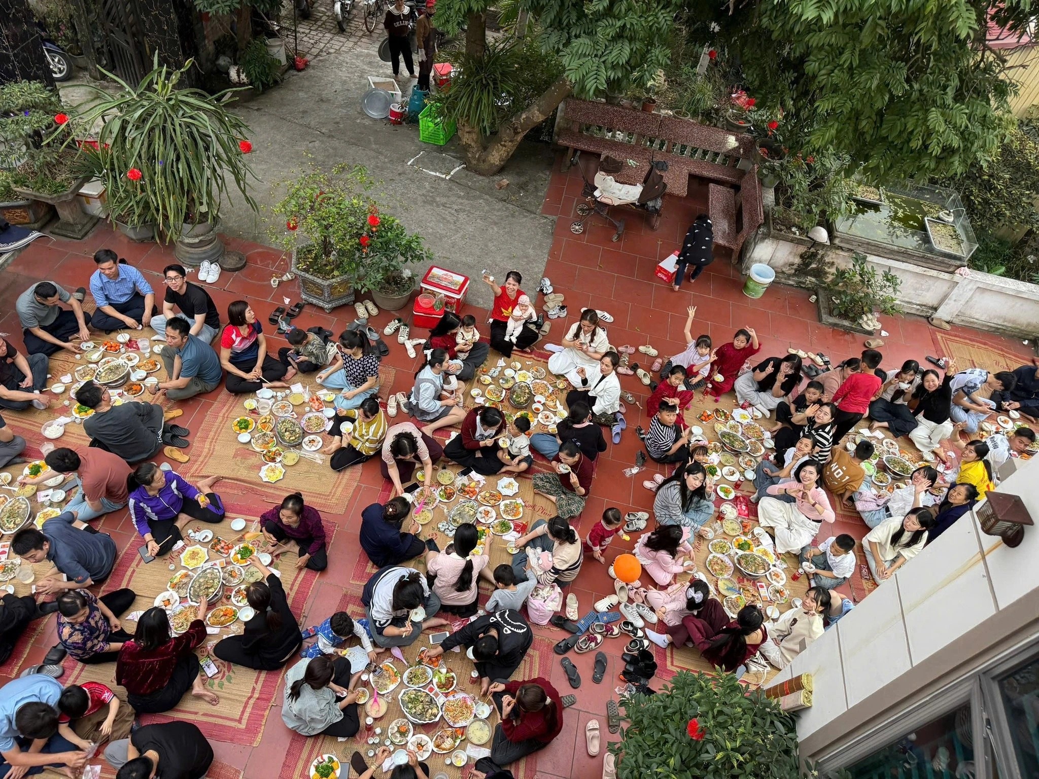 Con cháu trong nhà bày cỗ kín sân ăn Tết (Ảnh: Nhân vật cung cấp).