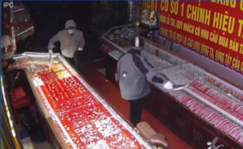 Trước đó, mạng xã hội lan truyền đoạn clip ghi lại cảnh 2 đối tượng mặc áo khoác, đội mũ, đeo găng tay, bịt khẩu trang trắng đi vào tiệm vàng. Trong đó, đối tượng đi trước cầm dao cảnh giới, đối tượng còn lại dùng búa đập vỡ kính tủ trưng bày.