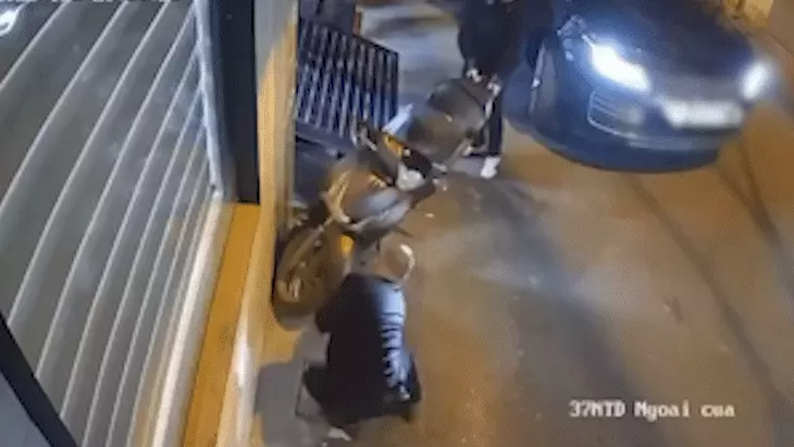 Sau đó, một người đàn ông khoảng ngoài 30 tuổi, mặc quần áo màu đen, từ trên xe ô tô bước xuống, lấy ra một vật nhọn rồi cúi xuống đâm hai lần vào lốp trước và lốp sau của xe máy, làm thủng lốp. Sau khi thực hiện hành vi, người này lên xe ô tô rời khỏi hiện trường.