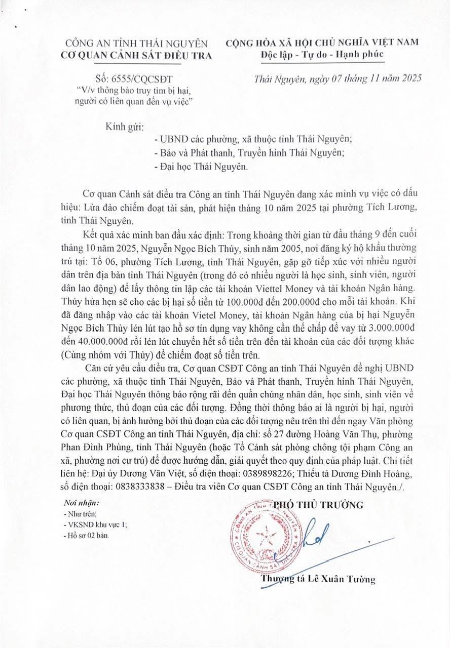 Công an tỉnh Thái Nguyên. Cơ quan cảnh sát điều tra thông báo tìm người bị hại