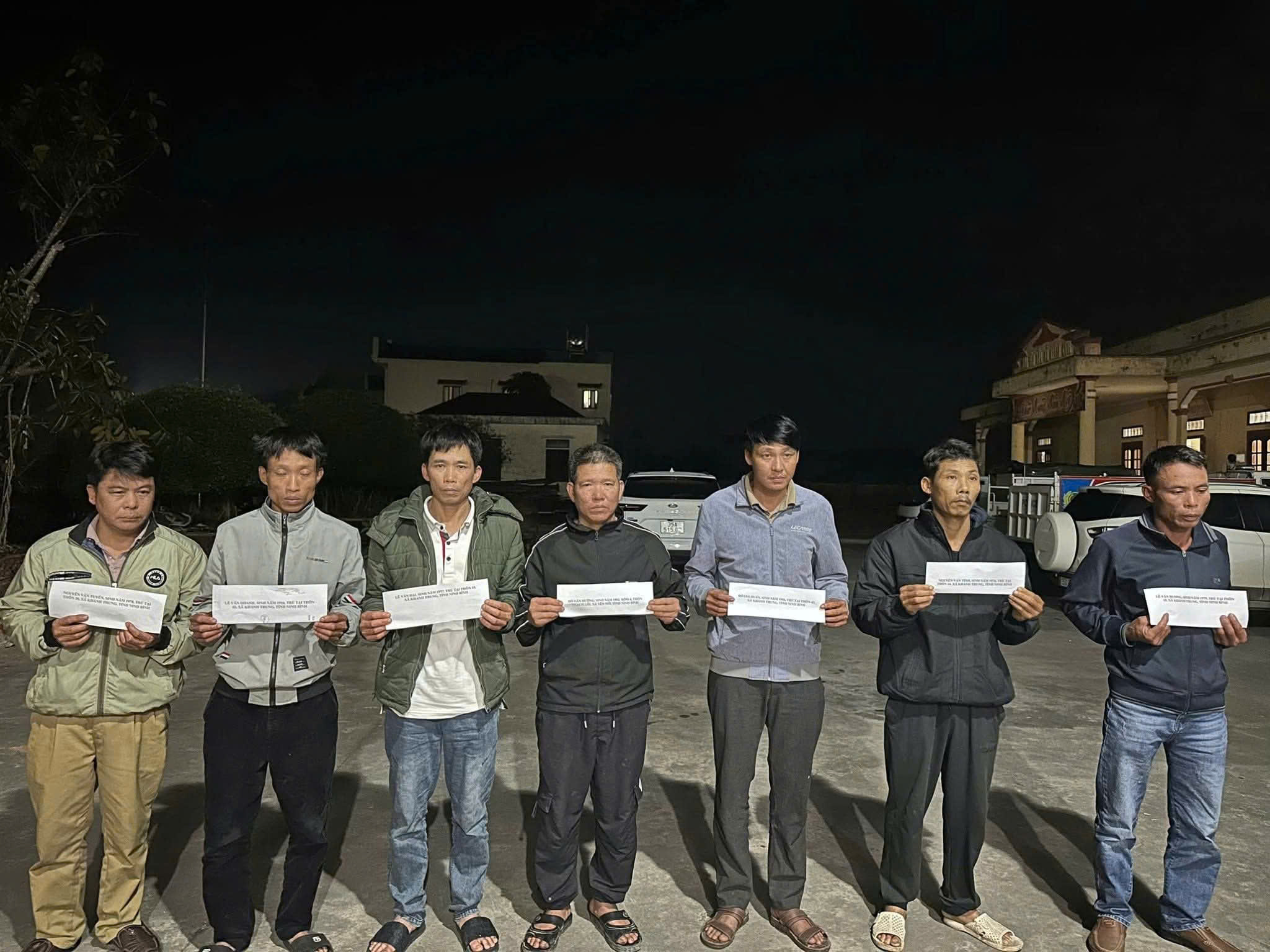 Các đối tượng bị bắt giữ gồm: Nguyễn Văn Tuyển (sinh năm 1978, trú thôn 30, xã Khánh Trung); Lê Văn Đại (sinh năm 1977); Đỗ Gia Huấn (sinh năm 1986); Lê Văn Dương (sinh năm 1979); Lê Văn Doanh (sinh năm 1986) cùng trú tại thôn 43, xã Khánh Trung; Nguyễn Văn Tỉnh (sinh năm 1976, trú thôn 44, xã Khánh Trung) và Đỗ Văn Hưởng (sinh năm 1982, trú tại xóm 4, xã Yên Mô, tỉnh Ninh Bình).