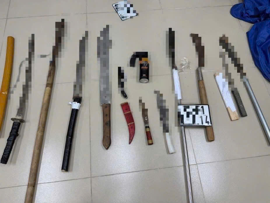 Qua kiểm tra khu vực xung quanh, lực lượng Công an phát hiện và thu giữ nhiều hung khí nguy hiểm, gồm 01 cây ki/ếm dài khoảng 1 mét, 02 cây m/ã t/ấu dài khoảng 80cm, 09 d/ao tự chế dài khoảng 50cm, 03 cây r/ựa, 01 bình xịt h/ơi c/ay, 02 s/úng bắn đạn bi cùng 95 viên đạn bi sắt và 02 biển số xe mô tô có liên quan. Toàn bộ tang vật đã được lập biên bản tạm giữ để phục vụ công tác xác minh, xử lý theo quy định.