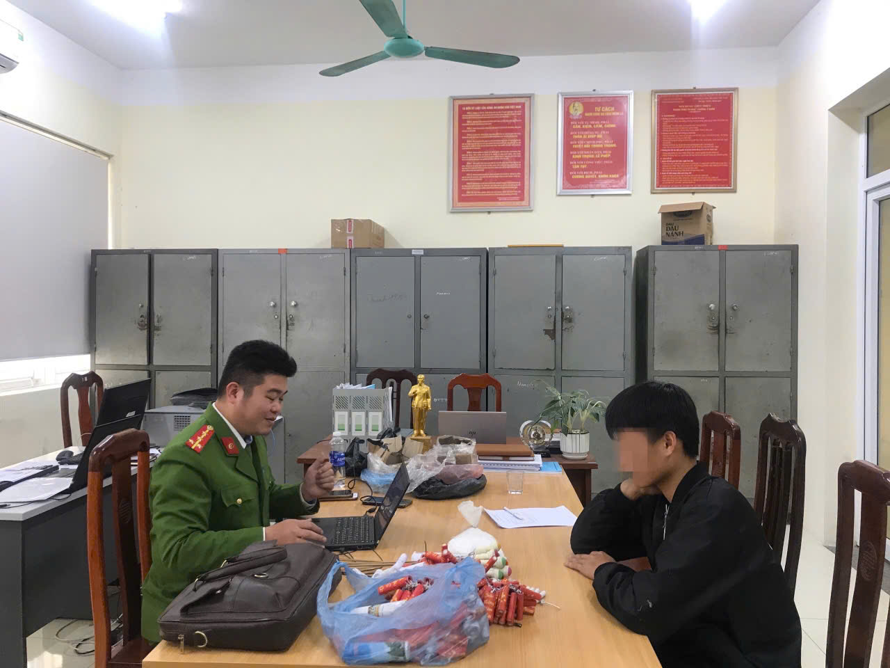 Hình ảnh H.C.Q và tang vật thu được tại cơ quan Công an