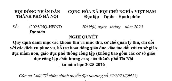 Ngày 27/10/2025, Ủy ban nhân dân thành phố Hà Nội đã công bố dự thảo Nghị quyết quy định danh mục các khoản thu và mức thu, cơ chế quản lý thu, chi đối với các dịch vụ phục vụ, hỗ trợ hoạt động giáo dục, đào tạo đối với cơ sở giáo dục mầm non, giáo dục phổ thông công lập (không bao gồm các cơ sở giáo dục công lập chất lượng cao) của thành phố Hà Nội từ năm học 2025-2026. (dự thảo Nghị quyết)