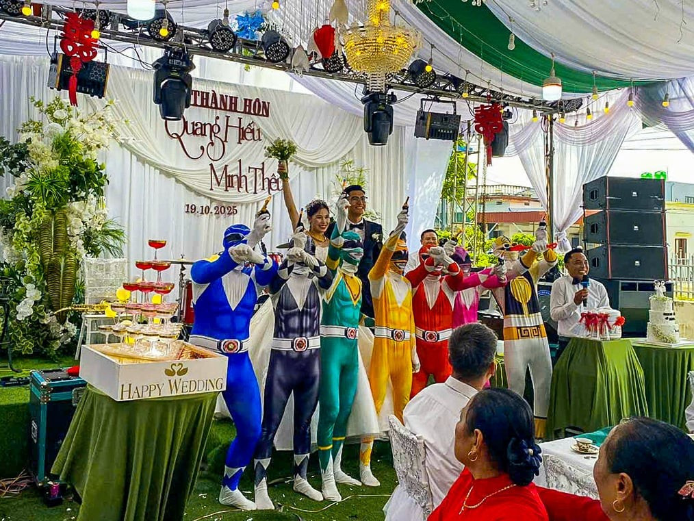 Mới đây, mạng xã hội chia sẻ đoạn clip ghi lại cảnh “7 anh em siêu nhân” tiến vào sân khấu đám cưới, vừa nhảy múa vừa tặng quà cho cô dâu, chú rể trong tiếng nhạc vui nhộn, khiến khách mời bật cười thích thú.