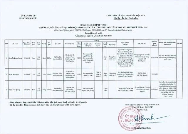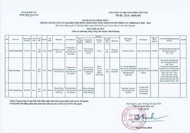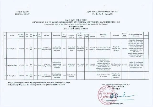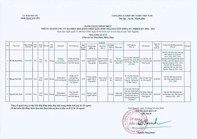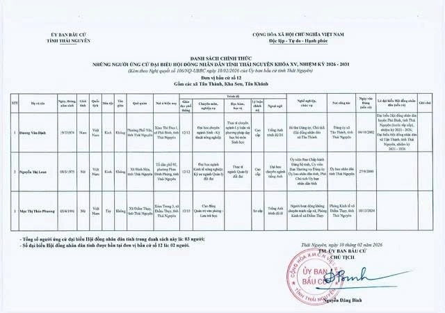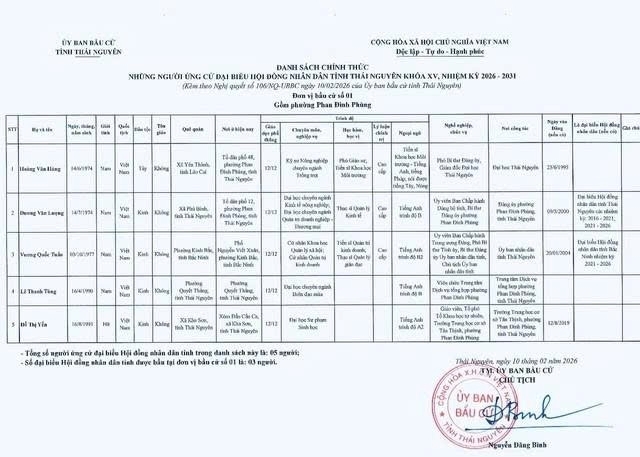 Danh sách chính thức những người ứng cử Đại biểu Hội đồng nhân dân tỉnh Thái Nguyên khóa XV, nhiệm kỳ 2026 – 2031 tại đơn vị bầu cử số 1 phường Phan Đình Phùng.