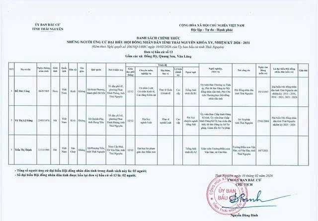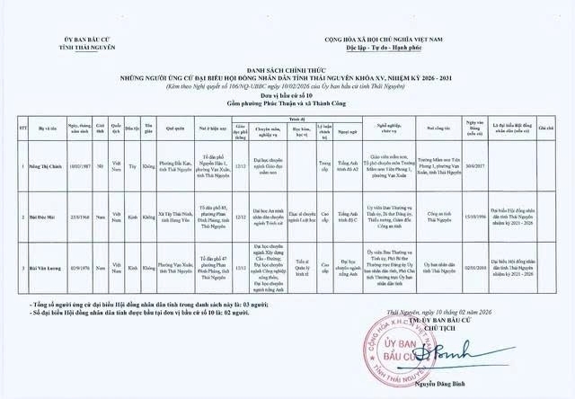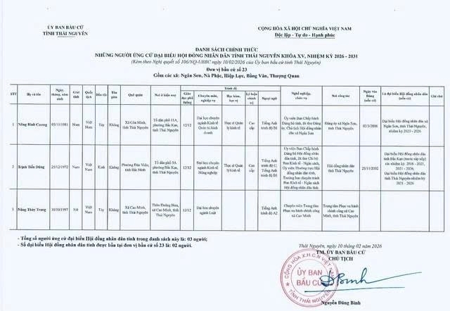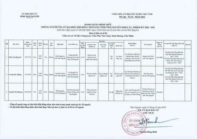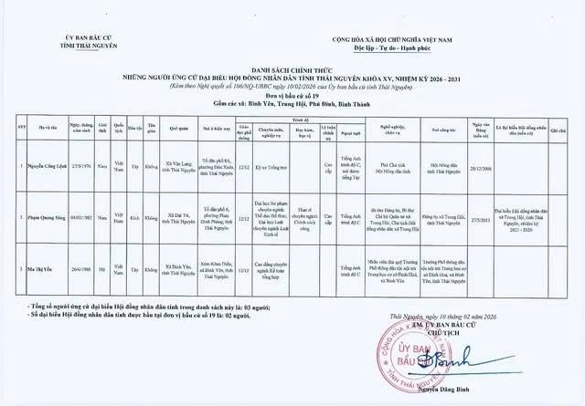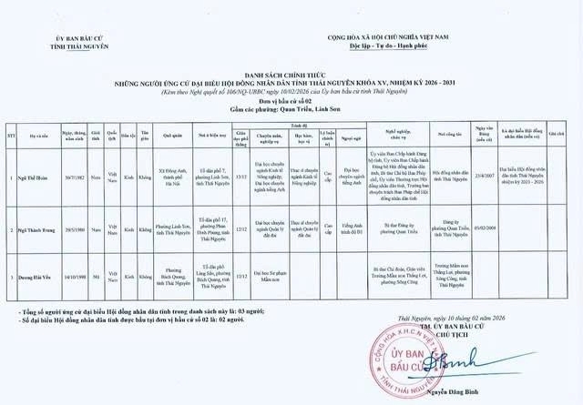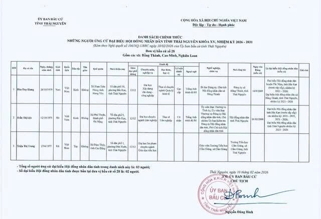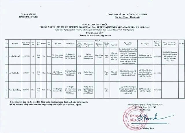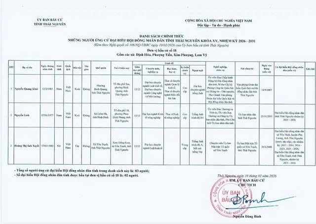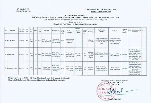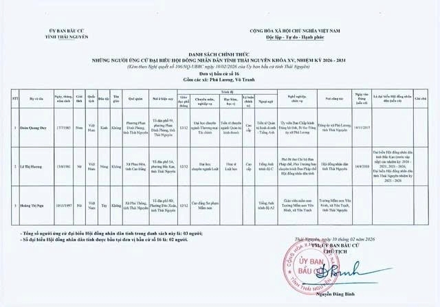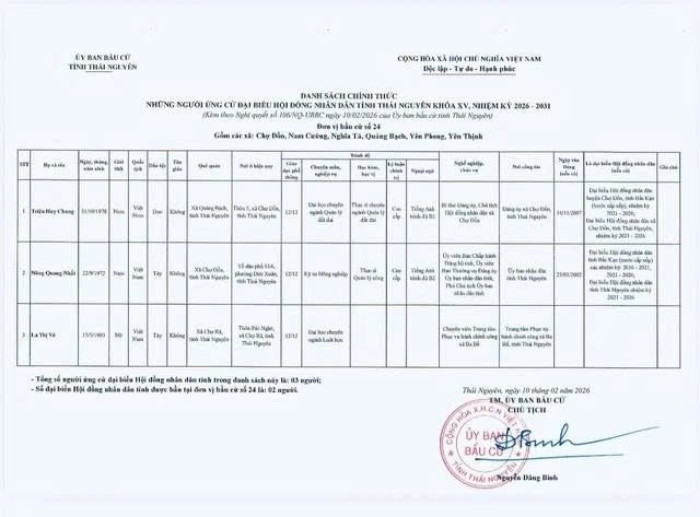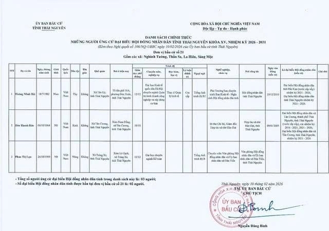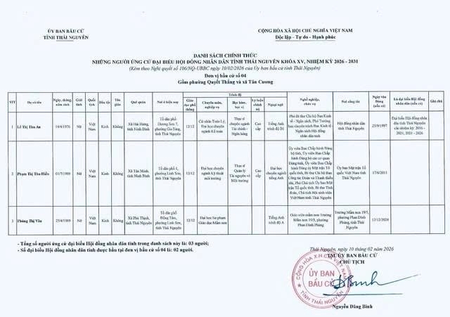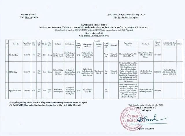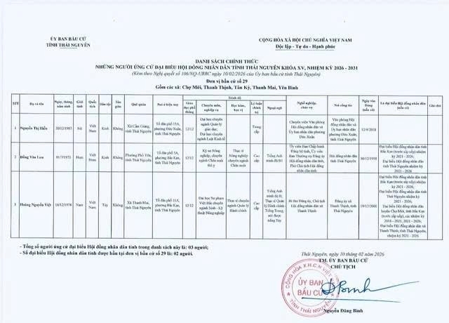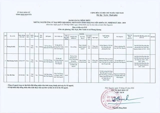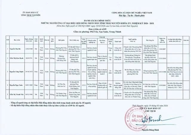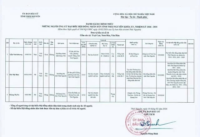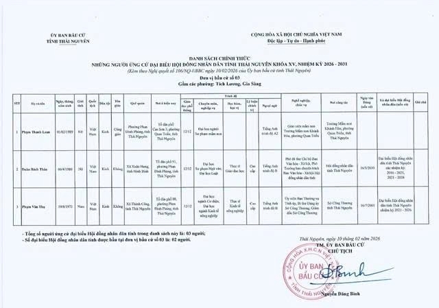 Ủy ban bầu cử tỉnh Thái Nguyên ban hành Nghị quyết công bố danh sách 91 người ứng cử Đại biểu Hội đồng nhân dân tỉnh khóa XV, nhiệm kỳ 2026 – 2031, theo 29 đơn vị bầu cử, để bầu 60 Đại biểu HĐND tỉnh.