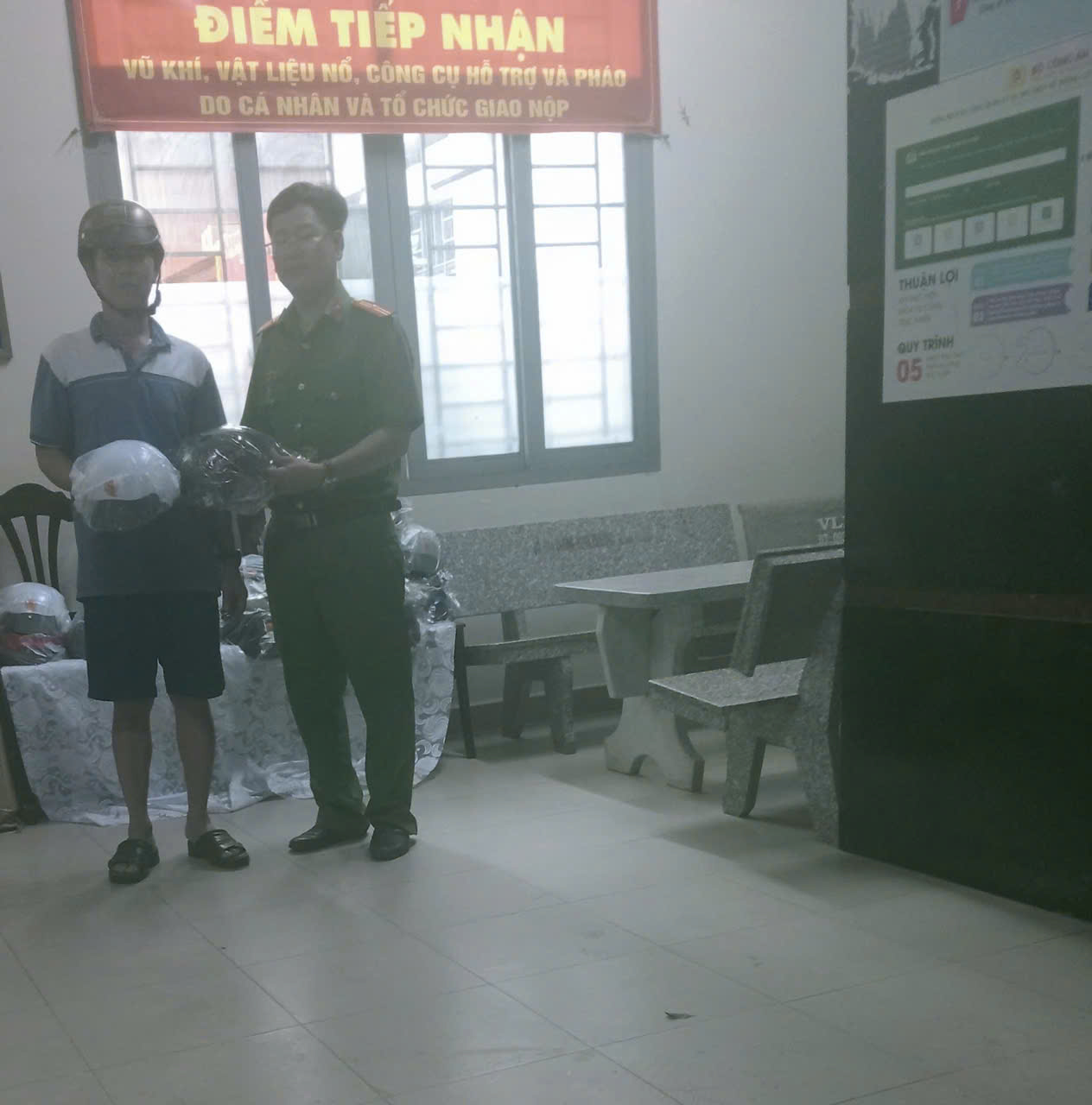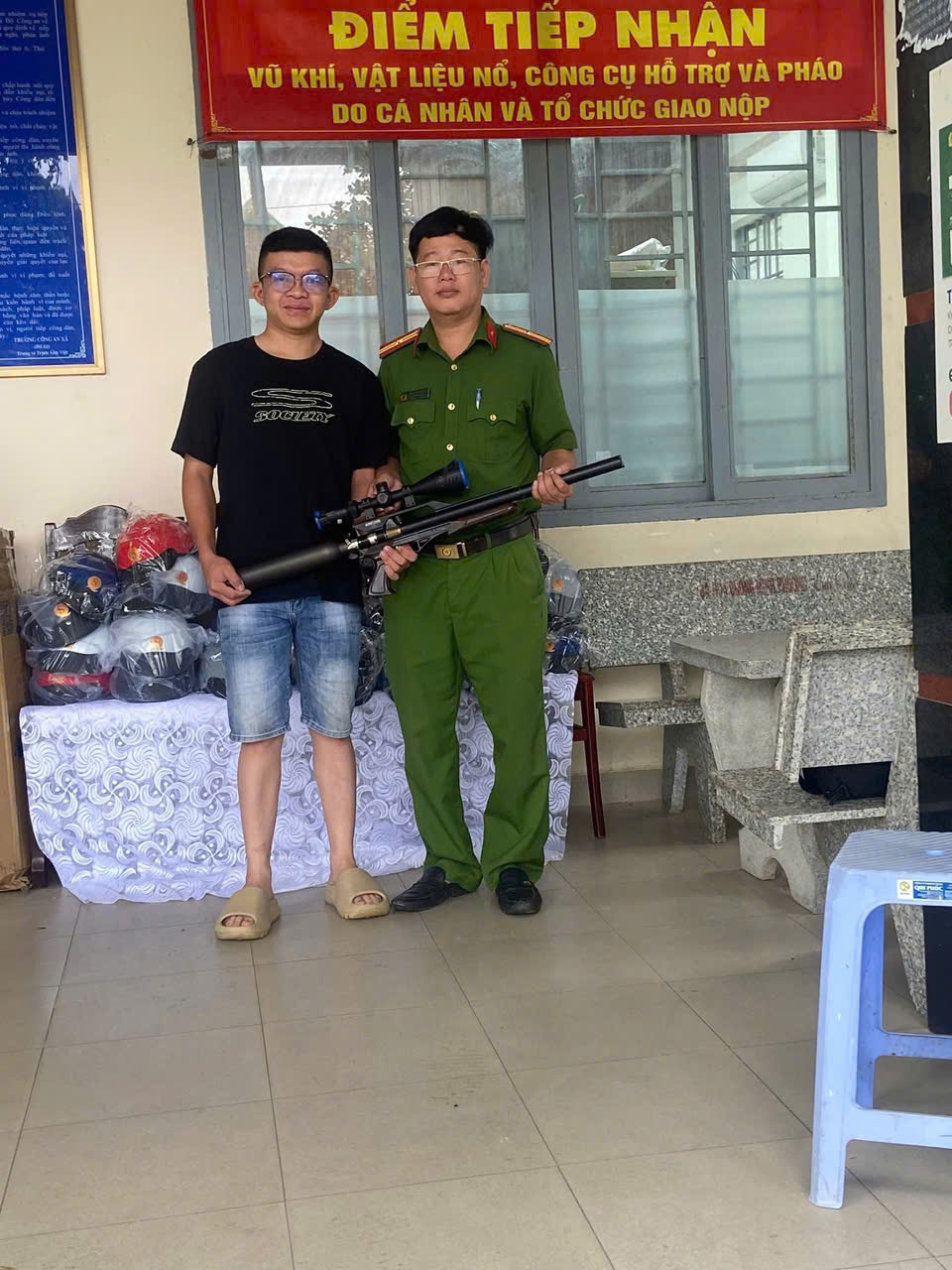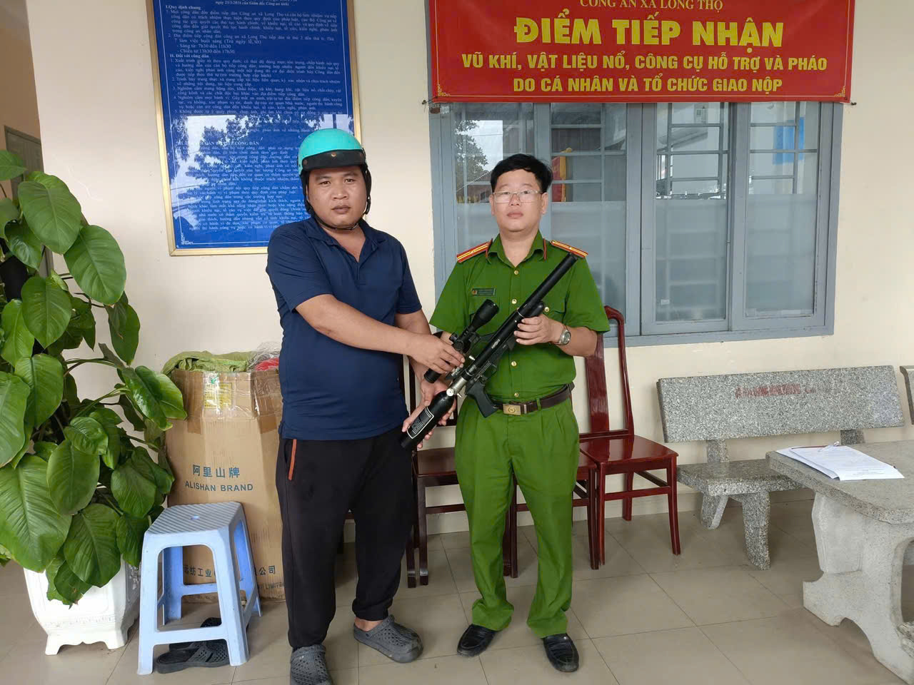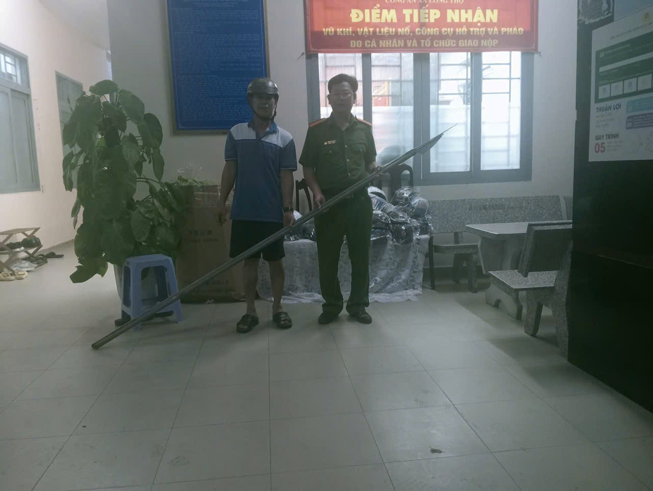 Công anh xã đã tiến hành trao tặng người dân giao nộp 01 mã tấu tặng 01 nón bảo hiểm; giao nộp 01 vũ khí tặng 02 nón bảo hiểm. Công an xã kêu gọi toàn dân giao nộp Vũ Khí-Vật liệu nổ-Công cụ hỗ trợ và pháo. Thực hiện tố giác các trường hợp tàng trữ, sử dụng, chế tạo, vận chuyển Vũ Khí-Vật liệu nổ-Công cụ hỗ trợ và pháo trái phép.