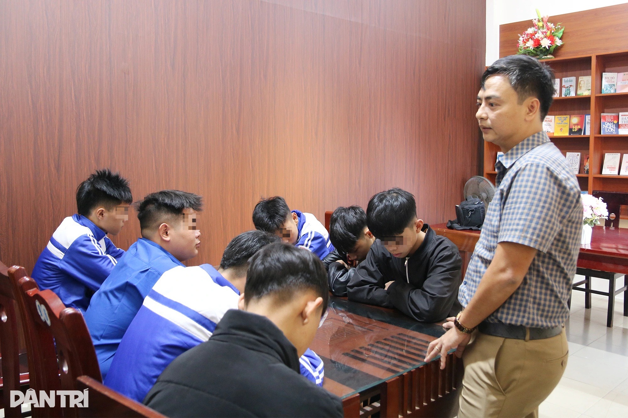 Thiếu tá Hoàng Thanh Hải, Trưởng Công an xã Diễn Châu, làm việc với nhóm học sinh có hành vi tụ tập đua xe được người dân phản ánh qua trang Fanpage công an xã (Ảnh: Hoàng Lam).