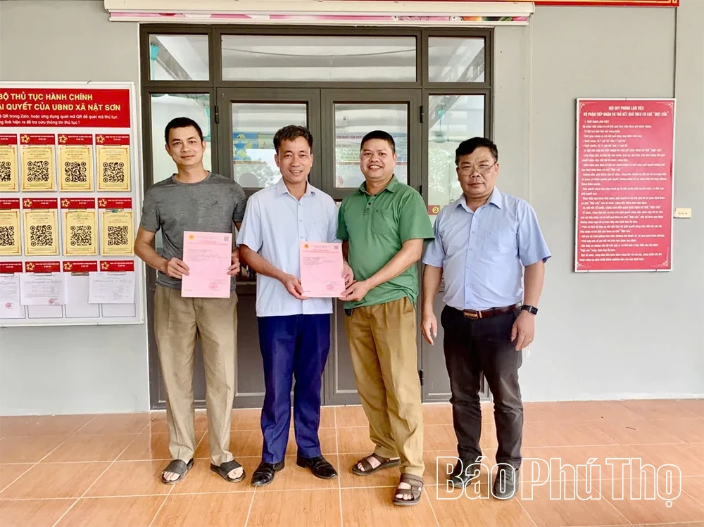 Lãnh đạo Trung tâm Phục vụ hành chính công xã Nật Sơn trao Giấy chứng nhận quyền sử dụng đất cho công dân.