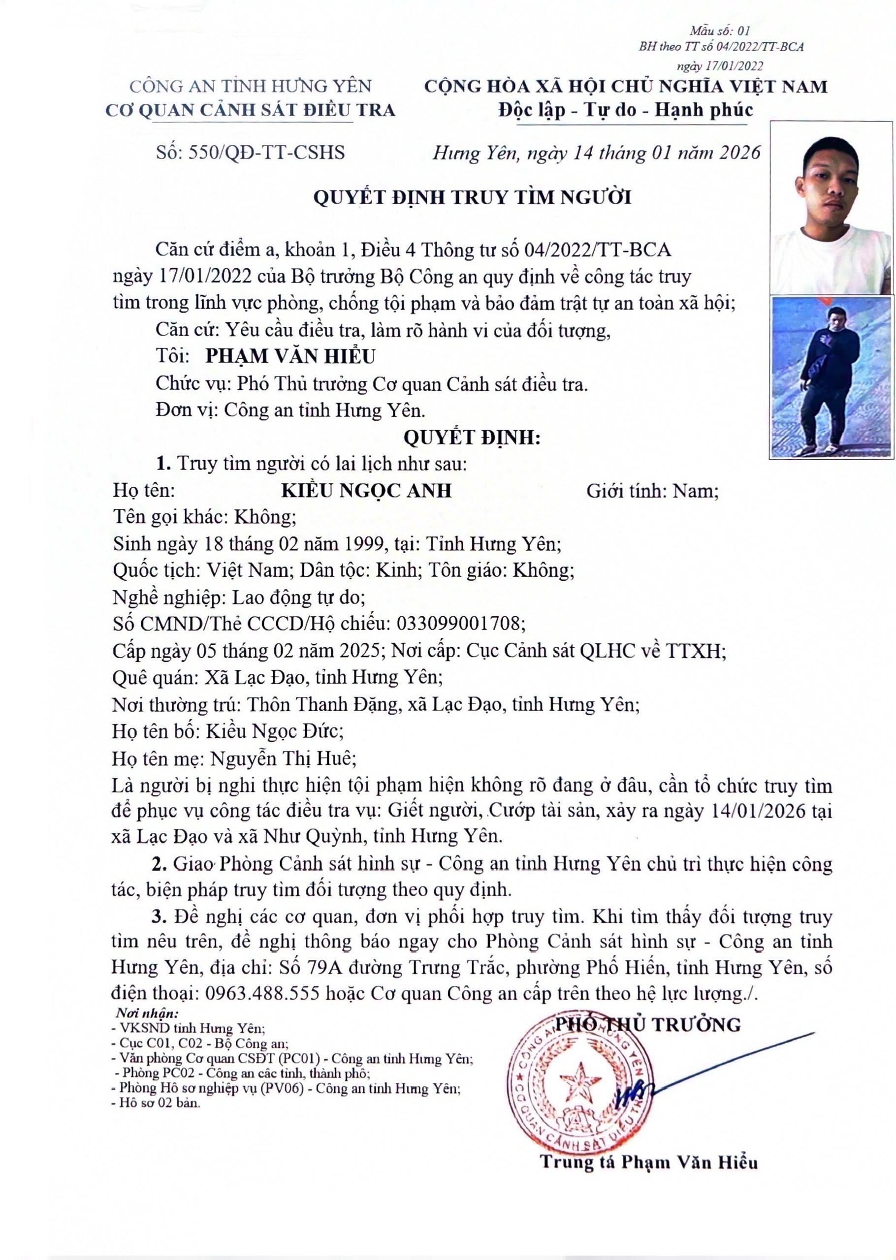 Trước đó, Cơ quan Cảnh sát điều tra Công an tỉnh Hưng Yên đã phát thông báo truy tìm nghi phạm liên quan đến hai vụ án mạng đặc biệt nghiêm trọng.