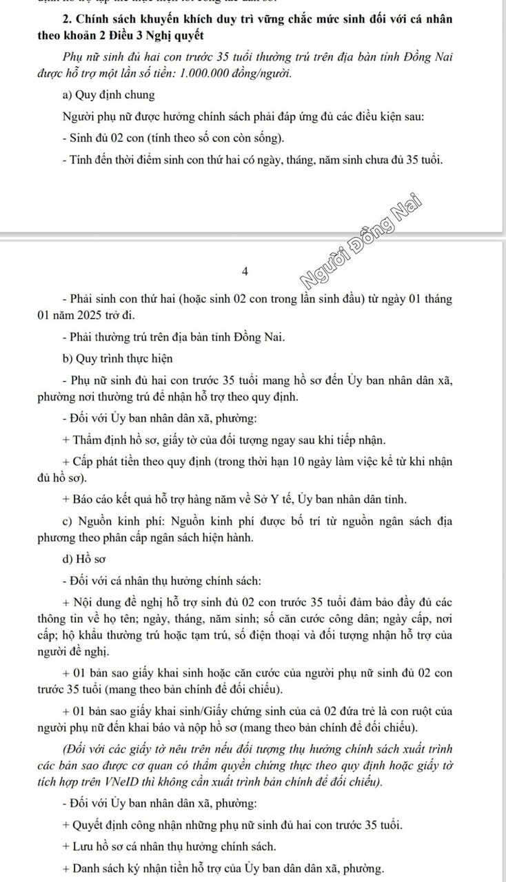 Đối với chính sách khuyến khích duy trì mức sinh, phụ nữ sinh đủ 2 con trước 35 tuổi, có hộ khẩu thường trú trên địa bàn tỉnh Đồng Nai, được hỗ trợ một lần 1 triệu đồng/người. Để nâng cao chất lượng dân số, phụ nữ mang thai và trẻ sơ sinh thuộc hộ nghèo, hộ cận nghèo theo chuẩn nghèo của tỉnh, đối tượng bảo trợ xã hội; người sống tại vùng đồng bào dân tộc thiểu số sẽ được miễn phí tầm soát trước sinh và sơ sinh tại các cơ sở y tế công lập trên địa bàn tỉnh.