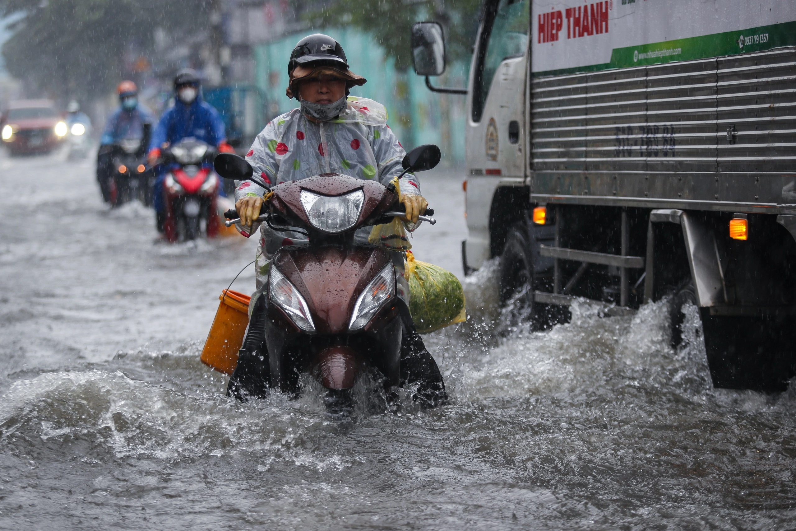 Người dân TP.HCM vất vả di chuyển sau cơn mưa lớn gây ngập nước