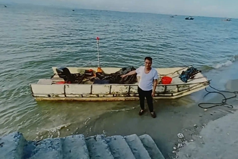 | Đối tượng CHEN FU HUI bên chiếc bè xốp gắn máy chở người nhập cảnh trái phép vào Việt Nam. Ảnh: CAQN |