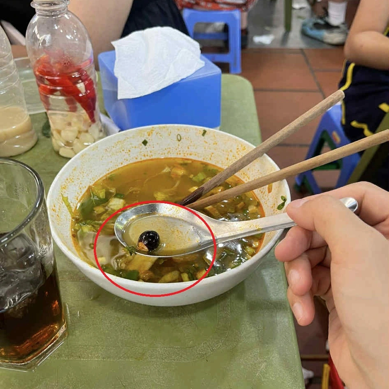 Tới quán bún riêu quen trên phố cổ (Hà Nội), chị V.A. thấy hạt nhãn nằm trong bát. Lo lắng về vấn đề vệ sinh thực phẩm, khách trao đổi với nhân viên của quán, nhưng không nhận được phản hồi phù hợp.