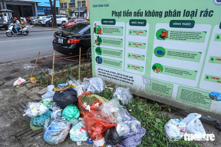Nhiều nơi tại Hà Nội cảnh báo phạt tiền nếu không phân loại nhưng rác thải đủ loại vẫn vứt bỏ ra vỉa hè – Ảnh: DANH KHANG