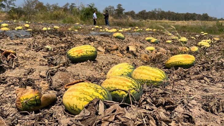 Một vùng trồng dưa hấu hàng chục ha tới kỳ thu hoạch tại xã Ia Mơ, tỉnh Gia Lai, bỏ chết giữa ruộng vì tranh chấp hợp đồng giữa nông dân và thương lái liên quan giá bán – Ảnh: L.T.
