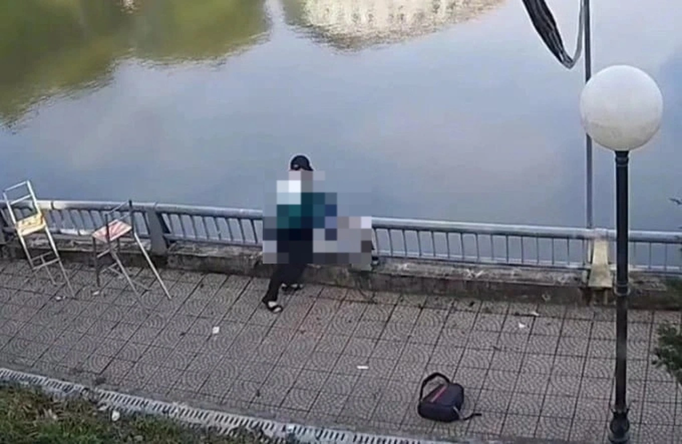 Hình ảnh nam sinh lớp 8 ở Lào Cai hất bạn xuống hồ nước sau khi đâm bạn nhiều nhát (Ảnh cắt từ clip).
