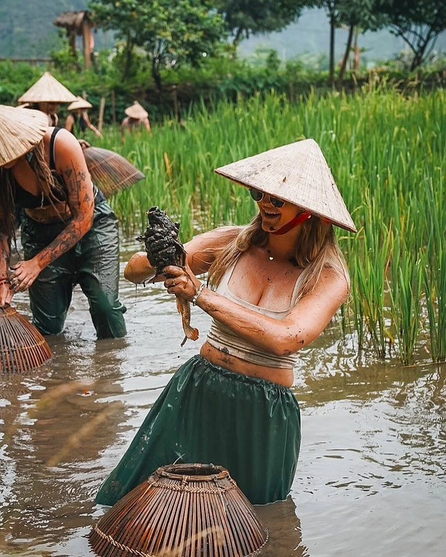 Tham gia tour “I am a famer” (tạm dịch: Tôi là một nông dân) giá 1,1 triệu đồng tại Hang Trâu (Ninh Bình), Amelia (quốc tịch Nga) cho biết mình đã có 5 tiếng để đời. Lần đầu tiên, cô mặc áo nâu sòng, đi chân trần, cầm nơm (dụng cụ bắt cá) và lội xuống ao.
