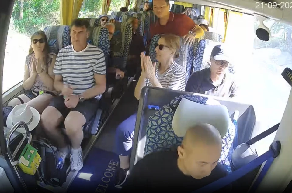 Trên xe, toàn bộ du khách nước ngoài đã thắt dây an toàn nên khi xe phanh gấp, chỉ có chút chao đảo nhẹ, không ai bị ngã nhào. Hai vị khách ngồi ghế đầu bên phải, vốn là vị trí dễ chịu tác động mạnh nhất, cũng được giữ chặt.