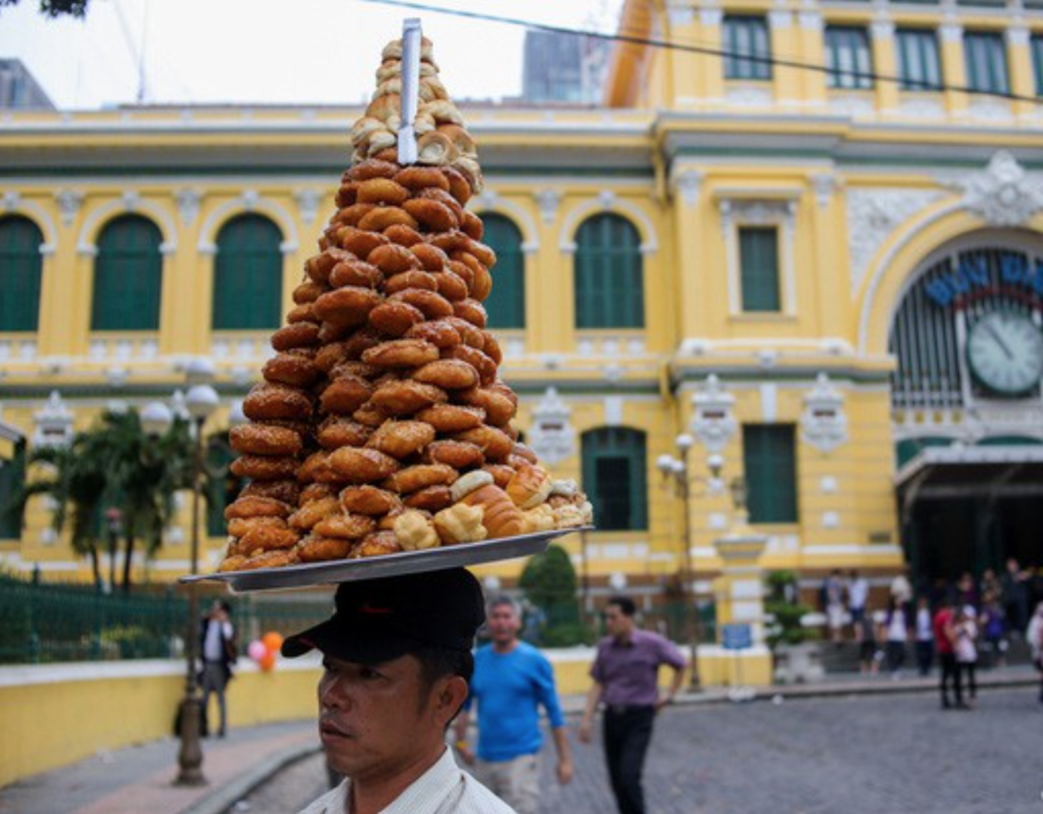 Thế nhưng, hồn cốt của bánh cam, bánh còng đâu chỉ ở hương vị. Nó còn nằm ở cách bán hàng độc đáo, mang đậm chất miền Tây. Người bán chẳng cần gánh gồng, cũng chẳng dùng xe đẩy. Họ cứ thế đội cả mâm bánh trên đầu, cao ngất ngưởng, cân bằng hoàn hảo đến mức tưởng như đang biểu diễn một màn nhào lộn. Khung cảnh ấy vừa gần gũi, vừa kỳ lạ, khiến ai nhìn thấy một lần cũng phải nhớ.
