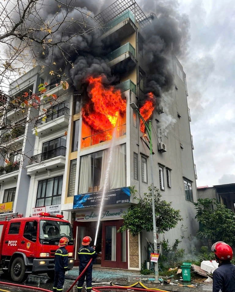 Tại hiện trường, đám cháy được xác định bùng phát từ tầng 3 của ngôi nhà 5 tầng, diện tích đám cháy khoảng 15m2. Do chứa nhiều vật dụng dễ cháy, ngọn lửa đã tạo ra cột khói khí độc bao trùm các tầng trên của tòa nhà, đe dọa trực tiếp đến các hộ dân lân cận.