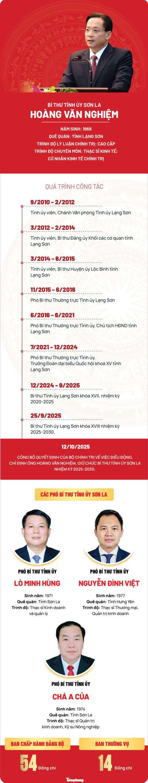 Lãnh đạo chủ chốt Tỉnh ủy Sơn La nhiệm kỳ 2025 – 2030 Bộ Chính trị điều động, chỉ định ông Hoàng Văn Nghiệm, giữ chức Bí thư Tỉnh ủy Sơn La nhiệm kỳ 2025-2030 từ ngày 12/10/2025.