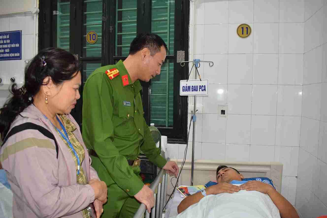 Đại tá Vũ Trung Thành – Phó Giám đốc Công an tỉnh đã đến thăm, động viên Đại úy Vũ Trường Giang sau khi bị thương khi làm nhiệm vụ.