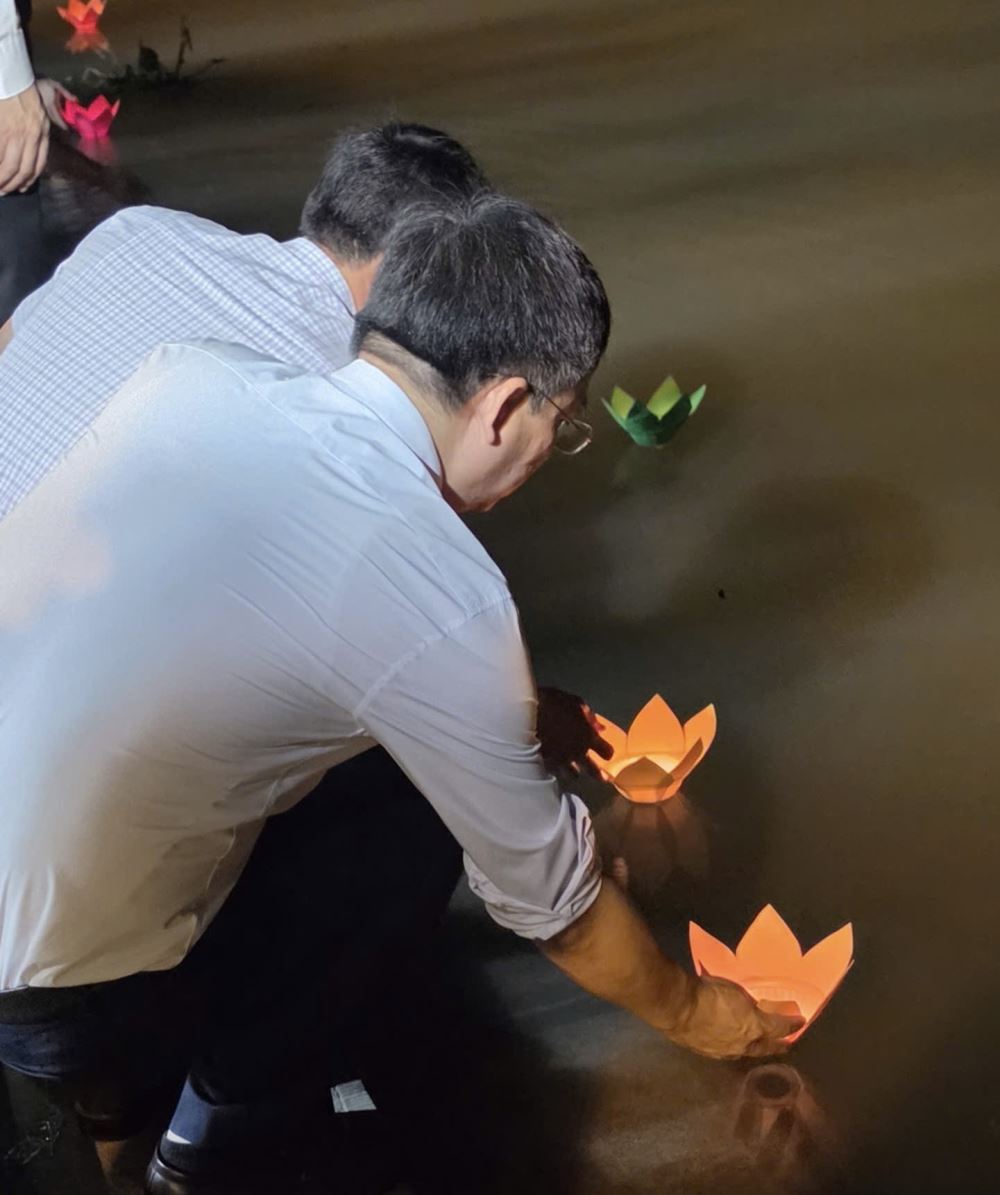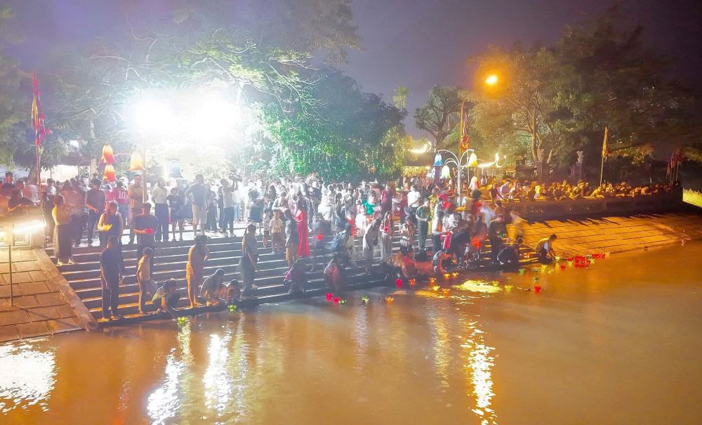 Nghi thức thả đèn hoa đăng tại bến đò cổ, tạo điểm nhấn thu hút đông đảo người dân và du khách.