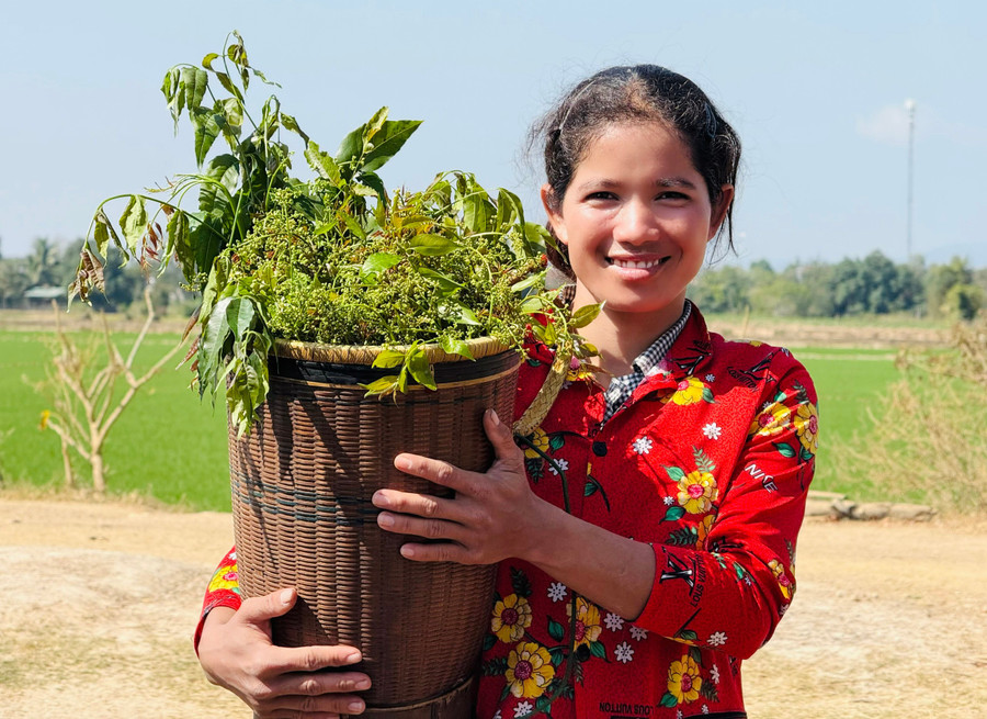 Niềm vui của chị Nay H’Ru khi hái được nhiều lá và hoa teng leng. Ảnh: Lạc Hà