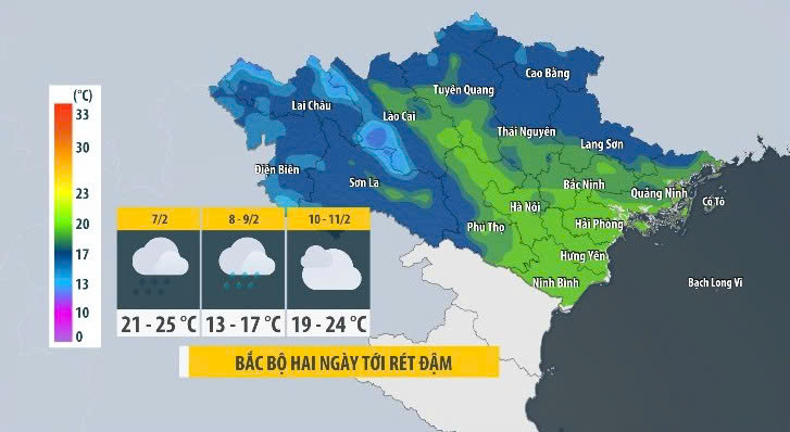 Đợt này, không khí lạnh kết hợp với gió Tây trên cao khiến mưa nhiều, Bắc Bộ chuyển rét nhanh từ đêm nay. Từ ngày mai đến thứ Hai sẽ là giai đoạn rét buốt nhất. Miền Bắc xảy ra rét đậm trên diện rộng, vùng núi có nơi rét hại. Nhiệt độ ban ngày chỉ 13 – 17 độ C; ban đêm và sáng sớm giảm còn 10 – 13 độ C, vùng núi 7 – 10 độ C, riêng vùng núi cao có nơi dưới 3 độ C. Nguy cơ băng giá có thể xuất hiện tại một số đỉnh núi cao.