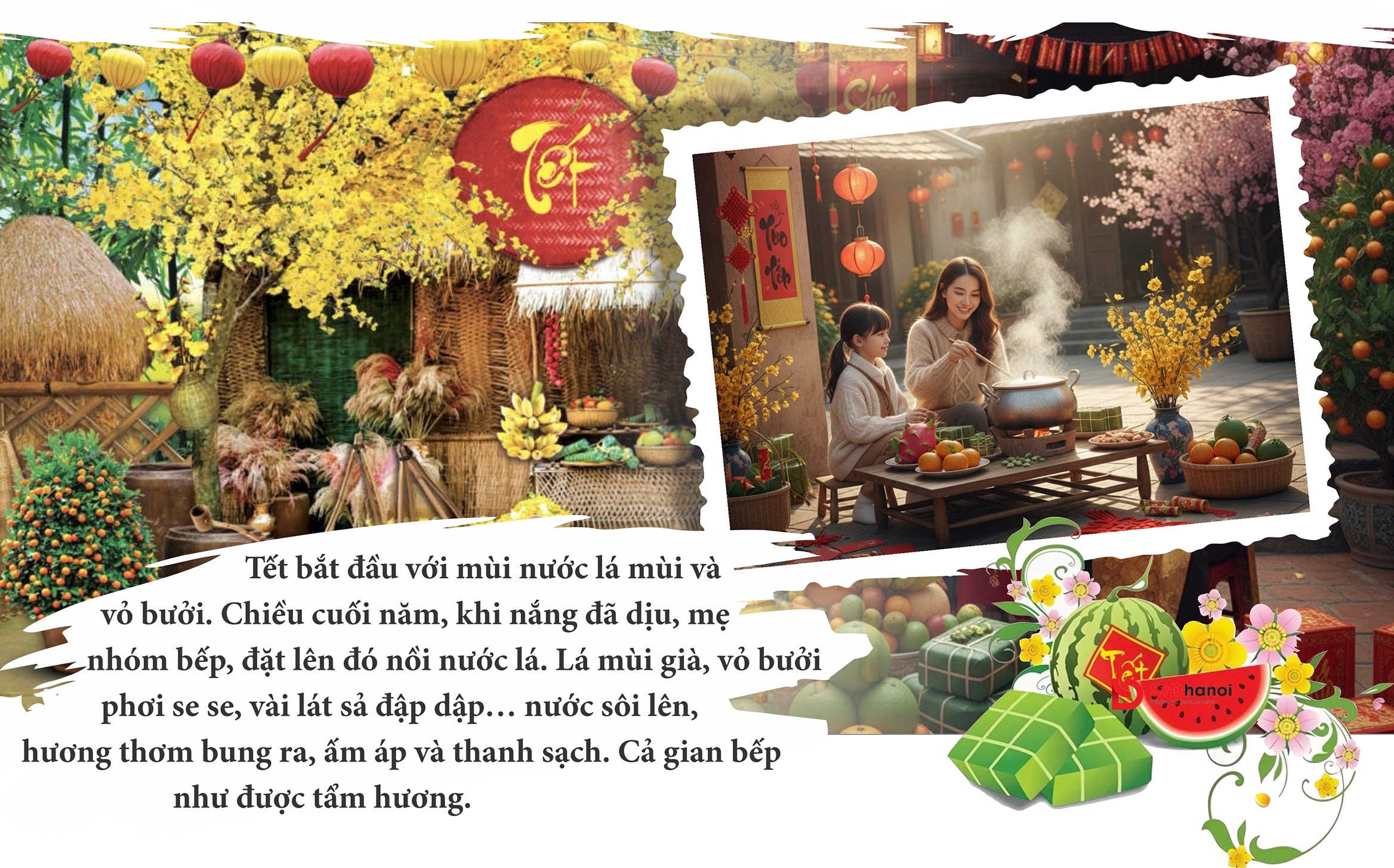 Tết bắt đầu với mùi nước lá mùi và vỏ bưởi. Chiều cuối năm, khi nắng đã dịu, mẹ nhóm bếp, đặt lên đó nồi nước lá. Lá mùi già, vỏ bưởi phơi se se, vài lát sả đập dập… nước sôi lên, hương thơm bung ra, ấm áp và thanh sạch. Cả gian bếp như được tẩm hương. Tôi dội từng gáo nước vàng rượm như từng dòng hương mơn man trên da thịt, cảm giác được gột rửa. Khi tắm đẫm mình trong dòng hương, vừa róc rách thân gần vừa có gì đó mơ hồ siêu thực ấy, tôi đã chạm vào Tết.